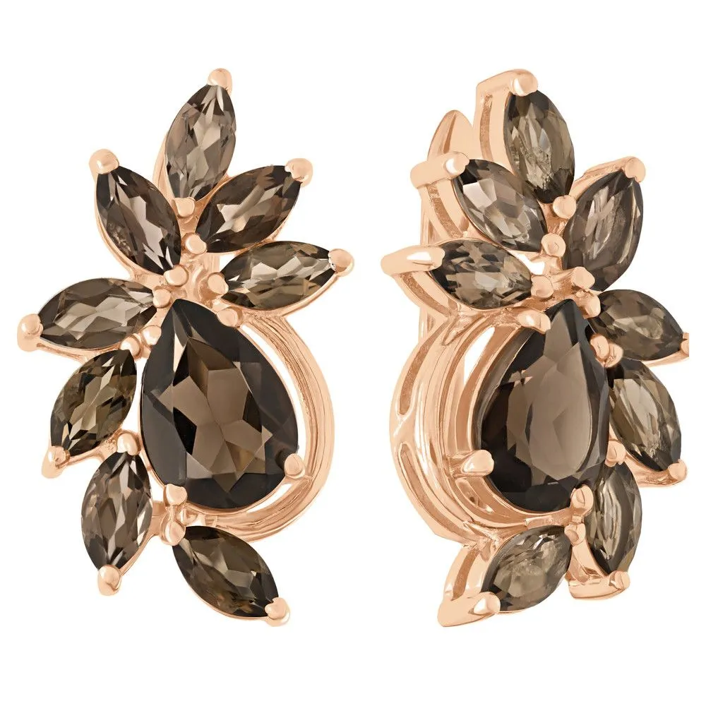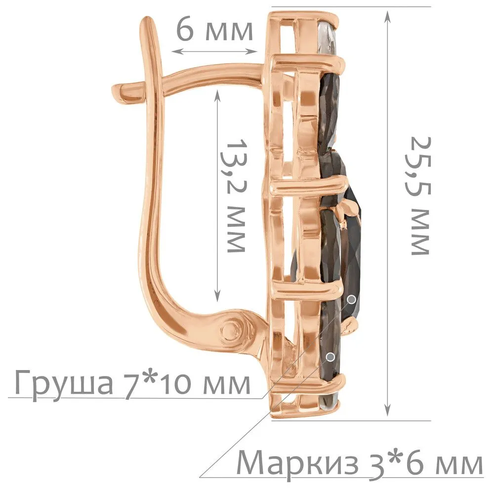 Серебряные серьги "Элегия" с натуральным раухтопазом (дымчатый кварц), покрытие Красное Золото. Средний вес украшения с камнями 6,99 гр. Месторождение(я) камней: Раухтопаз (Дымчатый кварц) (м-ние Додо ХМАО, Россия). Раухтопаз (Натуральный) груша: 7*10 мм., средний вес 1,85 карат. Раухтопаз (Натуральный) маркиз: 3*6 мм., средний вес 0,24 карат. Размер лицевой части: 15*24 мм. Все изделия собственного производства и имеют гарантию 12 месяцев. Арт. 6660RG . Раухтопаз – это разновидность кварца. Ранее он использовался в ювелирных украшениях, при вышивке картин, для магических ритуалов. Его влияние на владельца сразу становится заметно — человек успокаивается и становится рассудительным, легче выходит из депрессивных состояний. Часто использовался в приворотах, заговорах или для связи с миром духов.