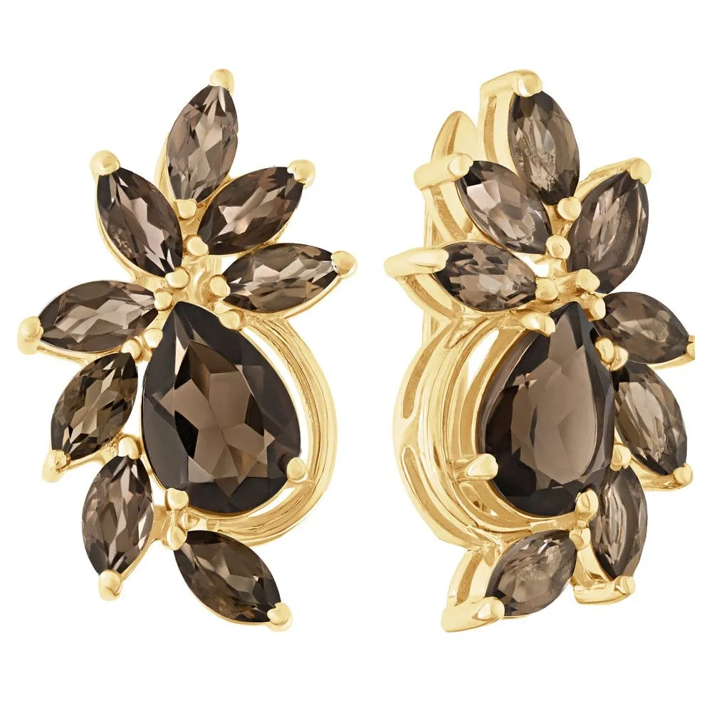Серебряные серьги "Элегия" с натуральным раухтопазом (дымчатый кварц), покрытие Желтое Золото. Средний вес украшения с камнями 6,99 гр. Месторождение(я) камней: Раухтопаз (Дымчатый кварц) (м-ние Додо ХМАО, Россия). Раухтопаз (Натуральный) груша: 7*10 мм., средний вес 1,85 карат. Раухтопаз (Натуральный) маркиз: 3*6 мм., средний вес 0,24 карат. Размер лицевой части: 15*24 мм. Все изделия собственного производства и имеют гарантию 12 месяцев. Арт. 6660YG . Раухтопаз – это разновидность кварца. Ранее он использовался в ювелирных украшениях, при вышивке картин, для магических ритуалов. Его влияние на владельца сразу становится заметно — человек успокаивается и становится рассудительным, легче выходит из депрессивных состояний. Часто использовался в приворотах, заговорах или для связи с миром духов.
