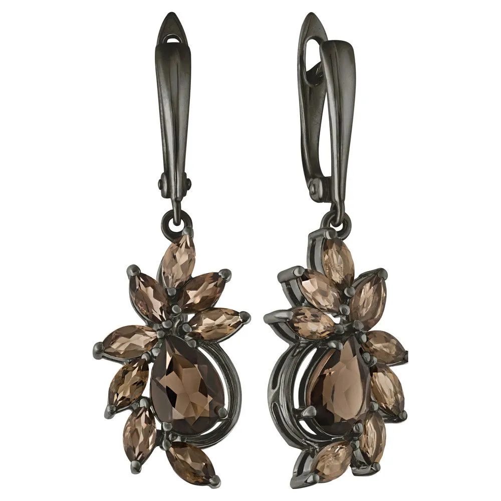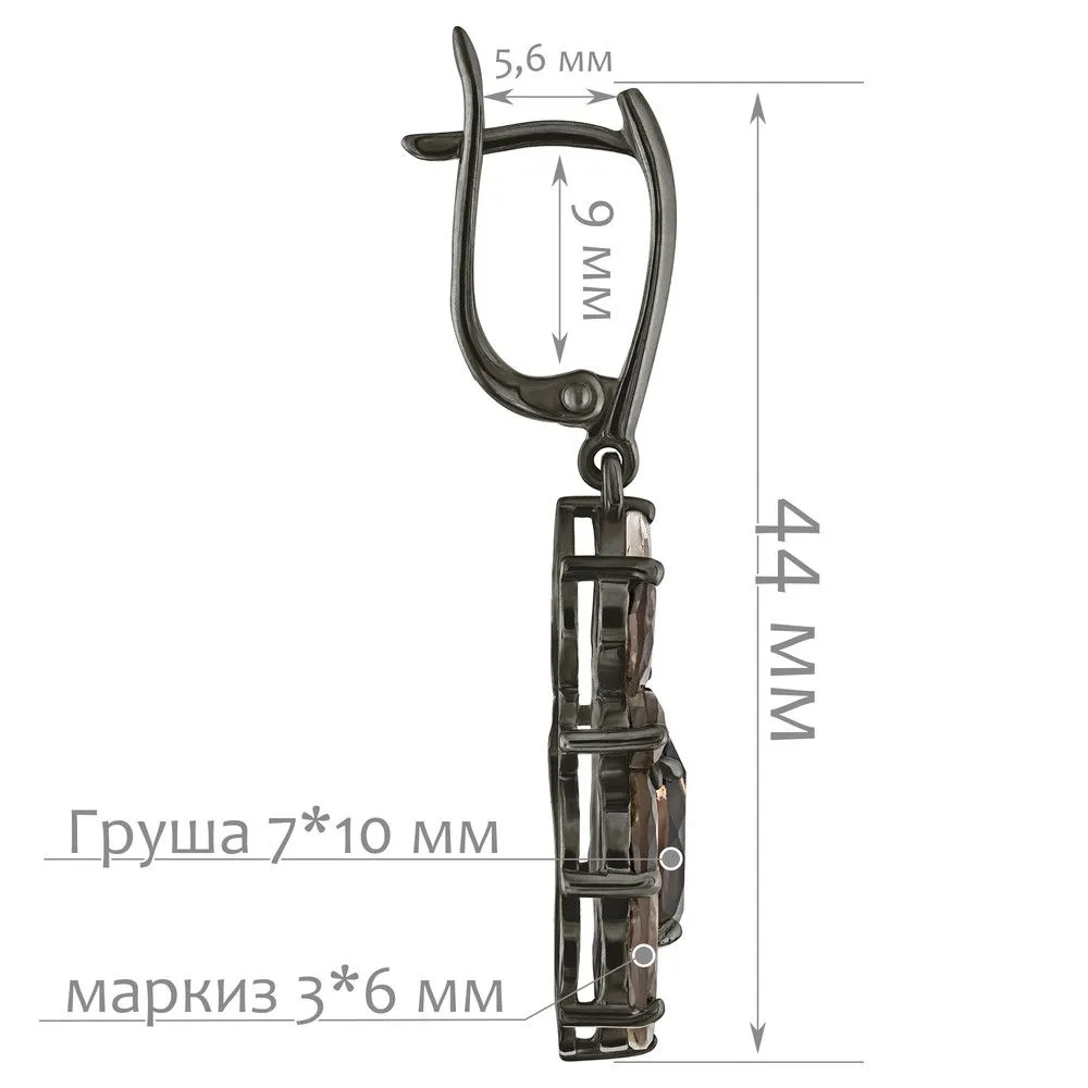 Серебряные серьги "Элегия" с натуральным раухтопазом (дымчатый кварц), покрытие Черный Родий. Средний вес украшения с камнями 7,53 гр. Месторождение(я) камней: Раухтопаз (Дымчатый кварц) (м-ние Додо ХМАО, Россия). Раухтопаз (Натуральный) груша: 7*10 мм., средний вес 1,85 карат. Раухтопаз (Натуральный) маркиз: 3*6 мм., средний вес 0,24 карат. Размер лицевой части: 15*43 мм. Все изделия собственного производства и имеют гарантию 12 месяцев. Арт. 6661BR . Раухтопаз – это разновидность кварца. Ранее он использовался в ювелирных украшениях, при вышивке картин, для магических ритуалов. Его влияние на владельца сразу становится заметно — человек успокаивается и становится рассудительным, легче выходит из депрессивных состояний. Часто использовался в приворотах, заговорах или для связи с миром духов.