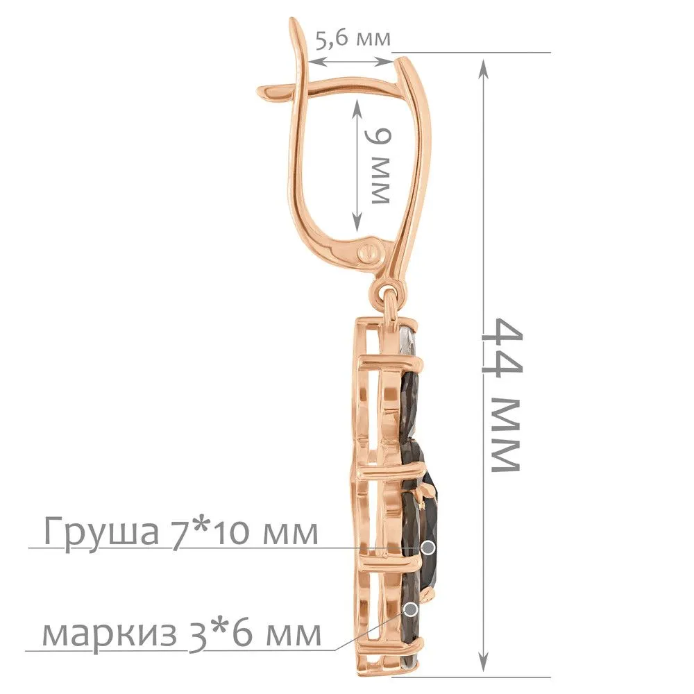 Серебряные серьги "Элегия" с натуральным раухтопазом (дымчатый кварц), покрытие Красное Золото. Средний вес украшения с камнями 7,53 гр. Месторождение(я) камней: Раухтопаз (Дымчатый кварц) (м-ние Додо ХМАО, Россия). Раухтопаз (Натуральный) груша: 7*10 мм., средний вес 1,85 карат. Раухтопаз (Натуральный) маркиз: 3*6 мм., средний вес 0,24 карат. Размер лицевой части: 15*43 мм. Все изделия собственного производства и имеют гарантию 12 месяцев. Арт. 6661RG . Раухтопаз – это разновидность кварца. Ранее он использовался в ювелирных украшениях, при вышивке картин, для магических ритуалов. Его влияние на владельца сразу становится заметно — человек успокаивается и становится рассудительным, легче выходит из депрессивных состояний. Часто использовался в приворотах, заговорах или для связи с миром духов.