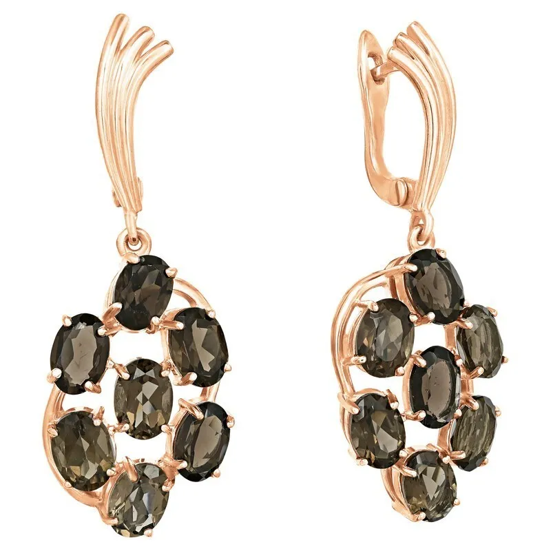 Серебряные серьги с натуральным раухтопазом (дымчатый кварц) - коллекция Аэлита. Серебряные серьги 925 пробы с покрытием красное золото. Цвет покрытия соответствует швейцарскому цветовому стандарту NIHS -5N и цвету красного золота 585 в России. На последней фотографии мы разместили сравнительную фотографию 3 цвета золотого покрытия. Помимо предания золотого цвета Вашему изделию, тонкий слой золота защищает от окисления. Для более стойкого эффекта золочения и долговечности покрытия мы дополнительно наносим подслой палладия (Pd). Средний вес изделия с камнями 9.95 гр. Месторождение: Раухтопаз (Дымчатый кварц) (м-ие Додо ХМАО, Россия). Раухтопаз (Натуральный) овал 5*7 мм., средний вес: 0.75 карат. Все изделия собственного производства. Гарантия 12 месяцев.Арт. 7824. Раухтопаз – это разновидность кварца. Ранее он использовался в ювелирных украшениях, при вышивке картин, для магических ритуалов. Его влияние на владельца сразу становится заметно — человек успокаивается и становится рассудительным, легче выходит из депрессивных состояний. Часто использовался в приворотах, заговорах или для связи с миром духов.