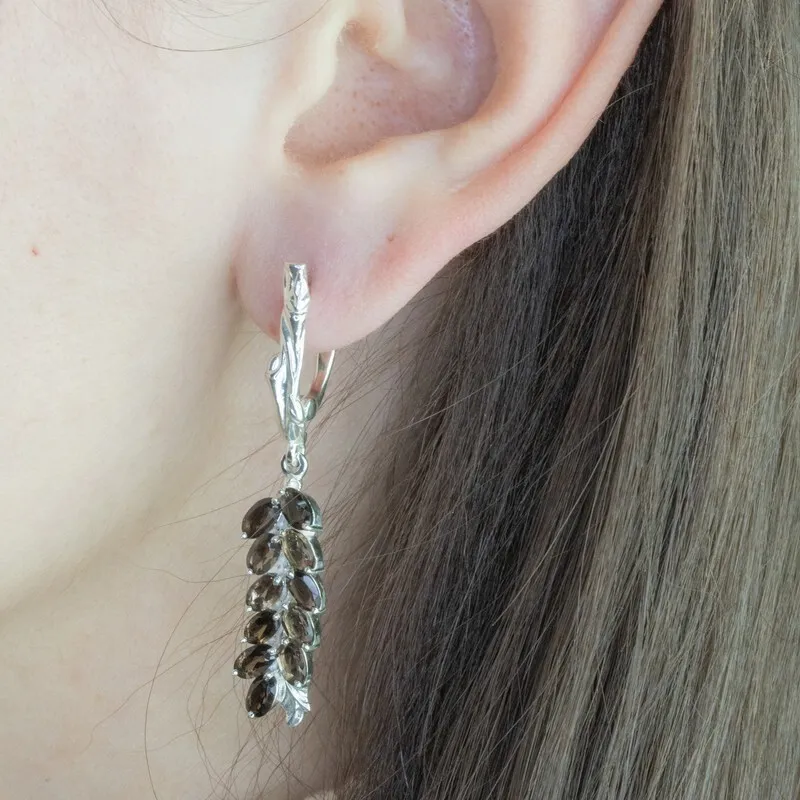 Серебряные серьги с натуральным раухтопазом - коллекция Флора / покрытие Палладий