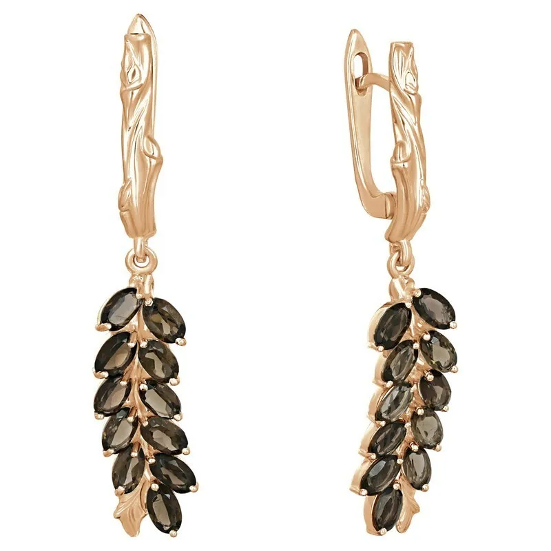 Серебряные серьги с натуральным раухтопазом - коллекция Флора. Серебряные серьги 925 пробы с покрытием розовое золото. Цвет покрытия соответствует швейцарскому цветовому стандарту NIHS -4N и цвету розового золота 585 в России. На последней фотографии мы разместили сравнительную фотографию 3 цвета золотого покрытия. Помимо предания золотого цвета Вашему изделию, тонкий слой золота защищает от окисления. Для более стойкого эффекта золочения и долговечности покрытия мы дополнительно наносим подслой палладия (Pd). Средний вес изделия с камнями 7.8 гр. Месторождение(я): Раухтопаз (Дымчатый кварц) (м-ие Додо ХМАО, Россия). Раухтопаз (Натуральный) овал 3*5 мм., средний вес: 0.2 карат. Размер лицевой части: 9*48 мм. Все изделия собственного производства. Гарантия 12 месяцев.Арт. 7852