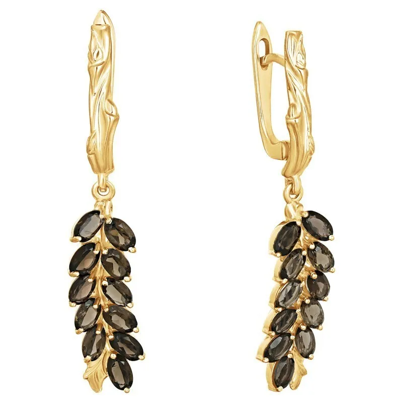 Серебряные серьги с натуральным раухтопазом - коллекция Флора. Серебряные серьги 925 пробы с покрытием желтое золото. Цвет покрытия соответствует швейцарскому цветовому стандарту NIHS -FF24ct и цвету чистого золото 999.99. На последней фотографии мы разместили сравнительную фотографию 3 цвета золотого покрытия. Помимо предания золотого цвета Вашему изделию, тонкий слой золота защищает от окисления. Для более стойкого эффекта золочения и долговечности покрытия мы дополнительно наносим подслой палладия (Pd). Средний вес изделия с камнями 7.8 гр. Месторождение(я): Раухтопаз (Дымчатый кварц) (м-ие Додо ХМАО, Россия). Раухтопаз (Натуральный) овал 3*5 мм., средний вес: 0.2 карат. Размер лицевой части: 9*48 мм. Все изделия собственного производства. Гарантия 12 месяцев.Арт. 7852