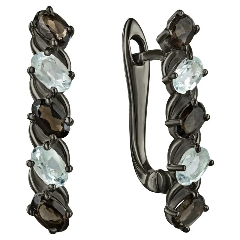Серебряные серьги с натуральными камнями раухтопаз и топаз - коллекция Колосок, покрытие Черный Родий.