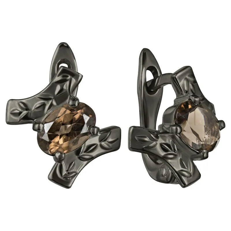 Серебряные серьги с натуральным раухтопазом - коллекция Тея, покрытие Черный Родий.