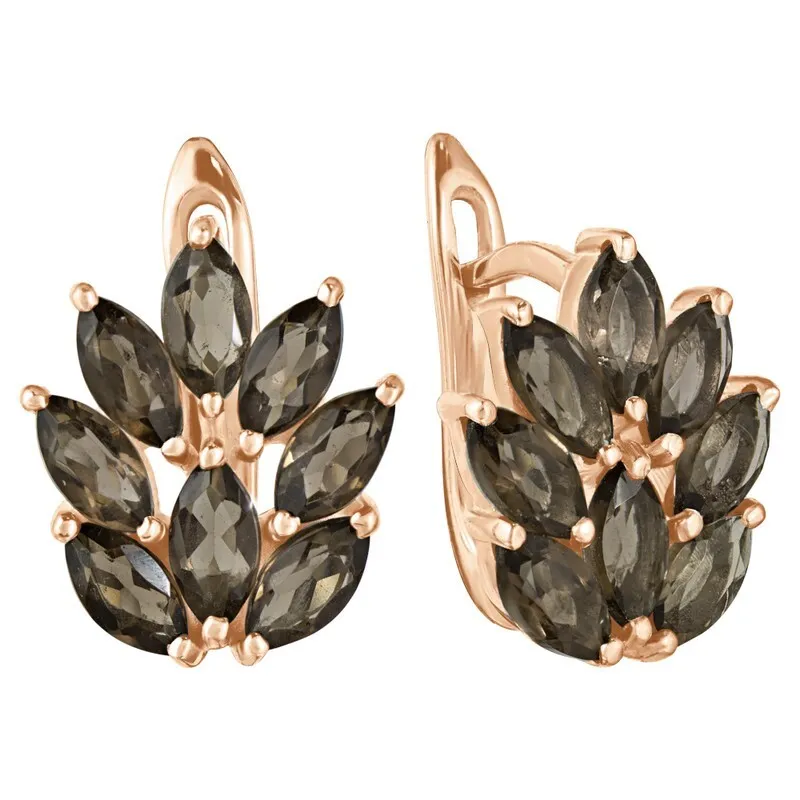 Серебряные серьги с натуральным раухтопазом - коллекция Искра. Серебряные серьги 925 пробы с покрытием красное золото. Цвет покрытия соответствует швейцарскому цветовому стандарту NIHS -5N и цвету красного золота 585 в России. На последней фотографии мы разместили сравнительную фотографию 3 цвета золотого покрытия. Помимо предания золотого цвета Вашему изделию, тонкий слой золота защищает от окисления. Для более стойкого эффекта золочения и долговечности покрытия мы дополнительно наносим подслой палладия (Pd). Средний вес изделия с камнями 4.31 гр. Месторождение: Раухтопаз (Дымчатый кварц) (м-ние Додо ХМАО, Россия) Раухтопаз (Натуральный) маркиз 3*6 мм., средний вес: 0.24 карат. Все изделия собственного производства. Гарантия 12 месяцев.Арт. 8142. Раухтопаз – это разновидность кварца. Ранее он использовался в ювелирных украшениях, при вышивке картин, для магических ритуалов. Его влияние на владельца сразу становится заметно — человек успокаивается и становится рассудительным, легче выходит из депрессивных состояний. Часто использовался в приворотах, заговорах или для связи с миром духов.