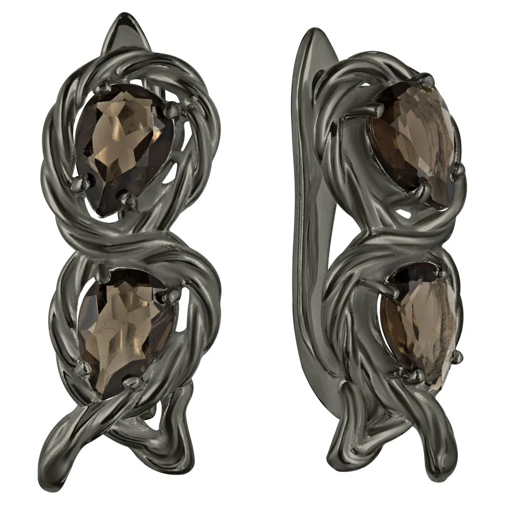 Серебряные серьги с натуральным раухтопазом - коллекция Ривьера, покрытие Черный Родий.