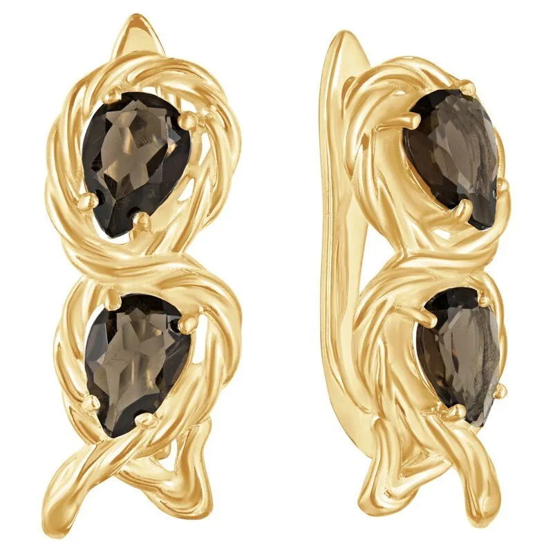 Серебряные серьги с натуральным раухтопазом - коллекция Ривьера. Серебряные серьги 925 пробы с покрытием желтое золото. Цвет покрытия соответствует швейцарскому цветовому стандарту NIHS -FF24ct и цвету чистого золото 999.99. На последней фотографии мы разместили сравнительную фотографию 3 цвета золотого покрытия. Помимо предания золотого цвета Вашему изделию, тонкий слой золота защищает от окисления. Для более стойкого эффекта золочения и долговечности покрытия мы дополнительно наносим подслой палладия (Pd). Средний вес изделия с камнями 4.78 гр. Месторождение: Раухтопаз (Дымчатый кварц) (м-ние Додо ХМАО, Россия) Раухтопаз (Натуральный) груша 5*7 мм., средний вес: 0.63 карат. Все изделия собственного производства. Гарантия 12 месяцев.Арт. 8159. Раухтопаз – это разновидность кварца. Ранее он использовался в ювелирных украшениях, при вышивке картин, для магических ритуалов. Его влияние на владельца сразу становится заметно — человек успокаивается и становится рассудительным, легче выходит из депрессивных состояний. Часто использовался в приворотах, заговорах или для связи с миром духов.