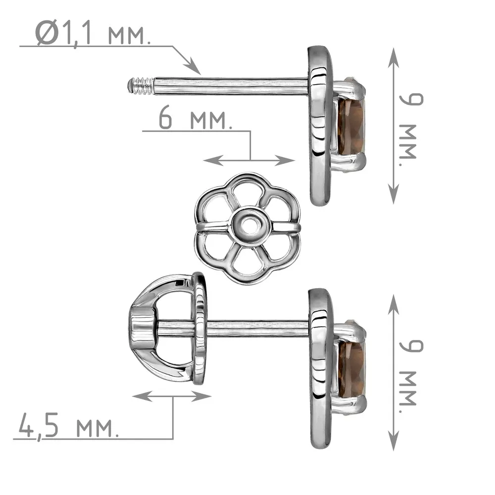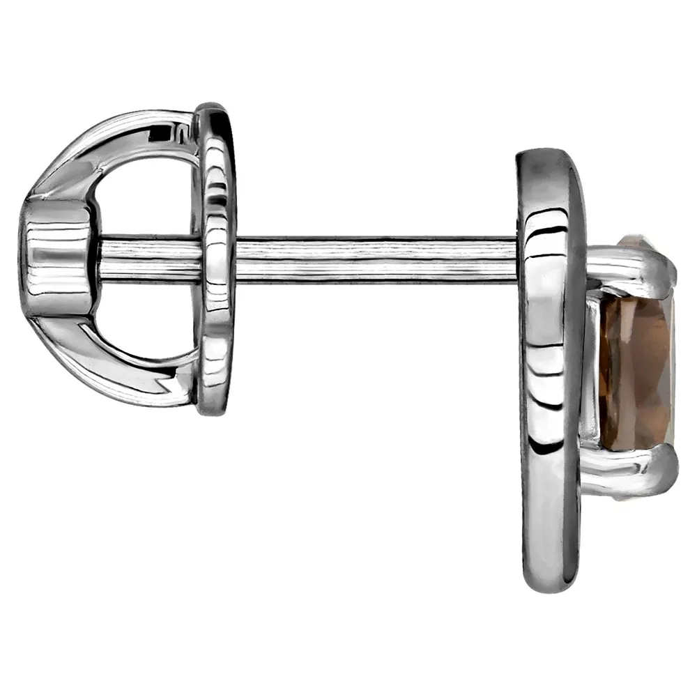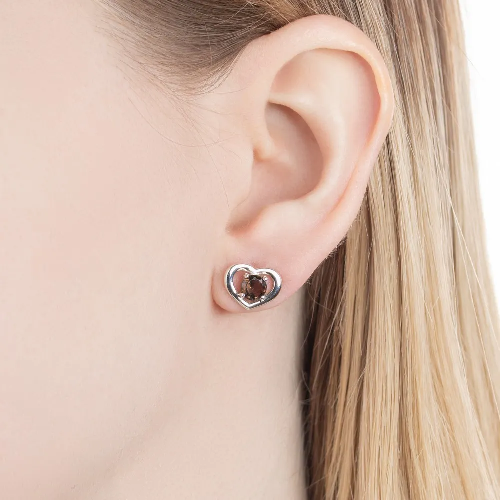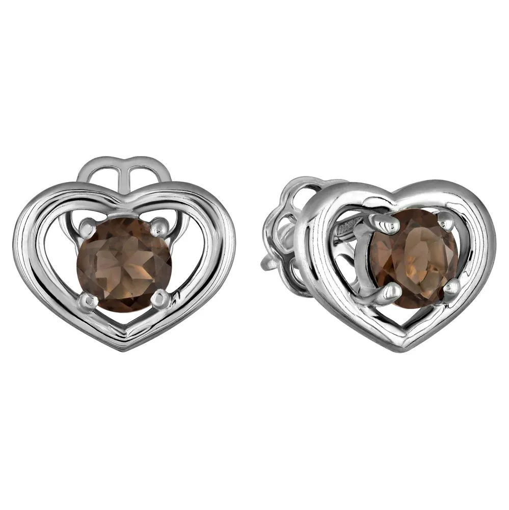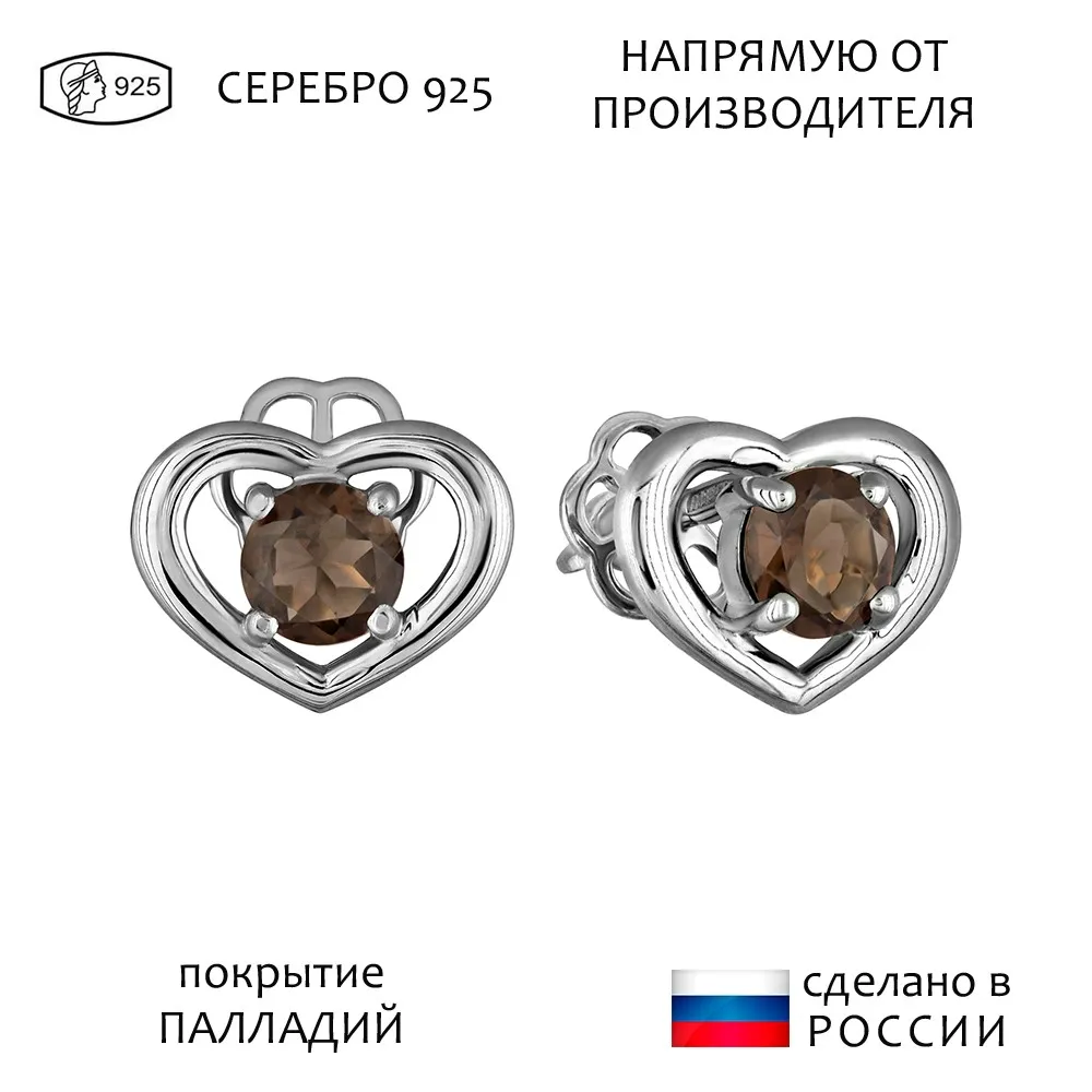 Серебряные серьги гвоздики (пусеты) с натуральным раухтопазом - Сердце / покрытие Палладий.