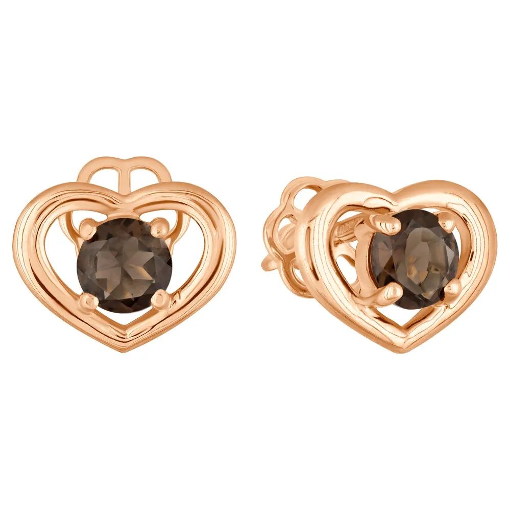 Серебряные серьги гвоздики (пусеты) с натуральным раухтопазом - Сердце / покрытие Красное золото.