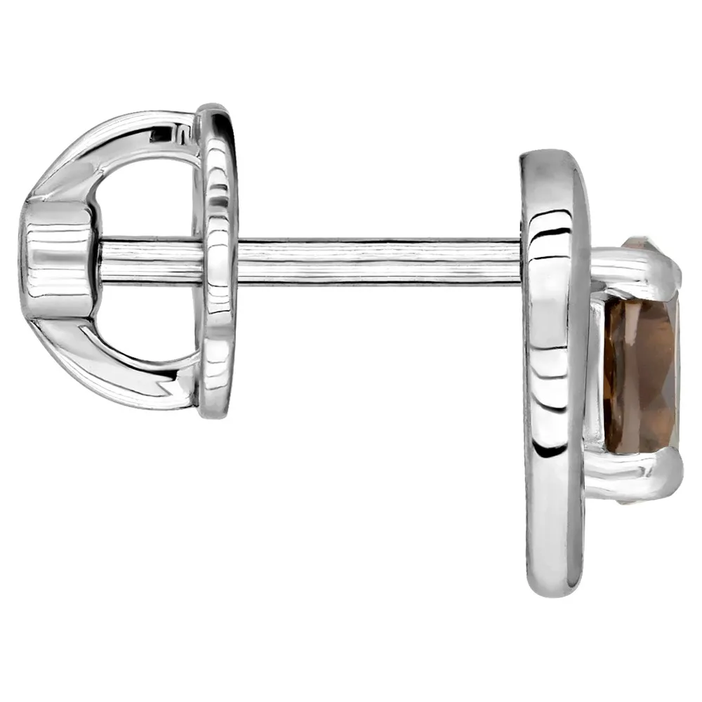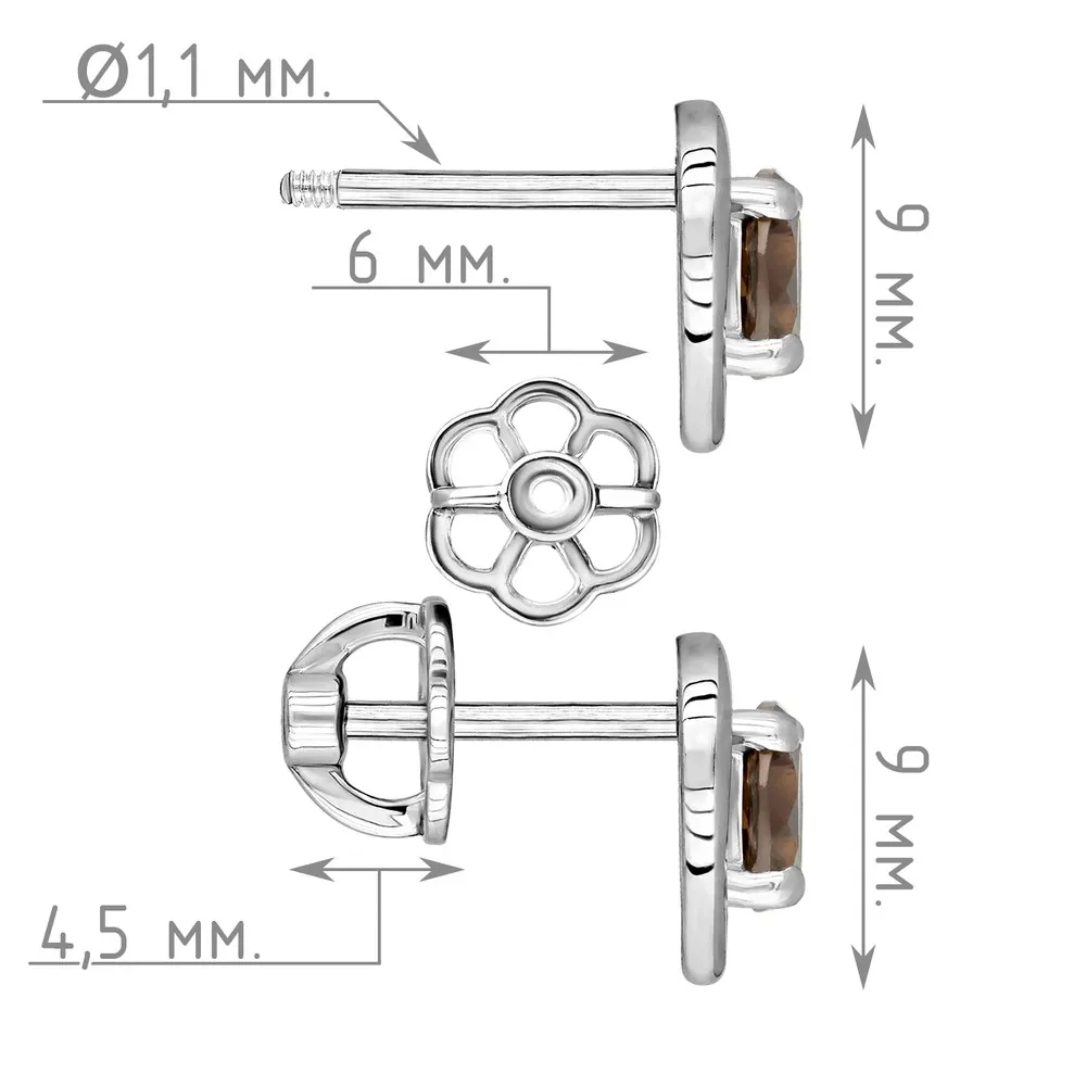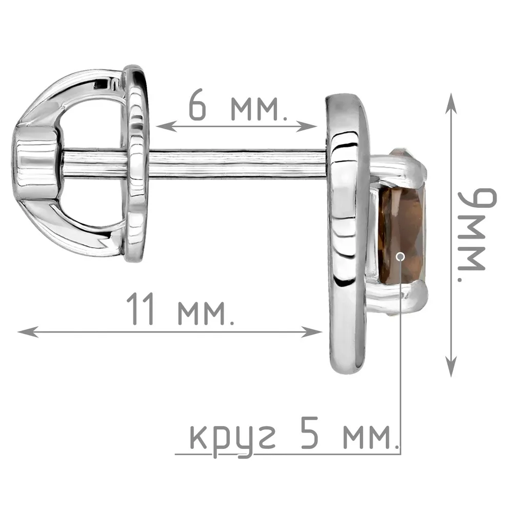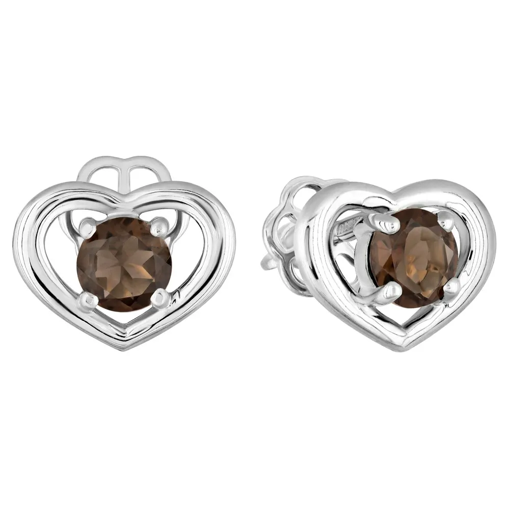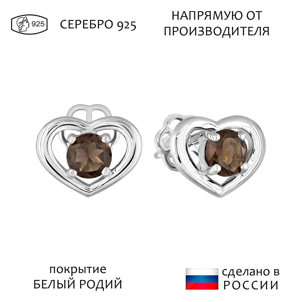 Серебряные серьги гвоздики (пусеты) с натуральным раухтопазом - Сердце / покрытие Белый Родий.