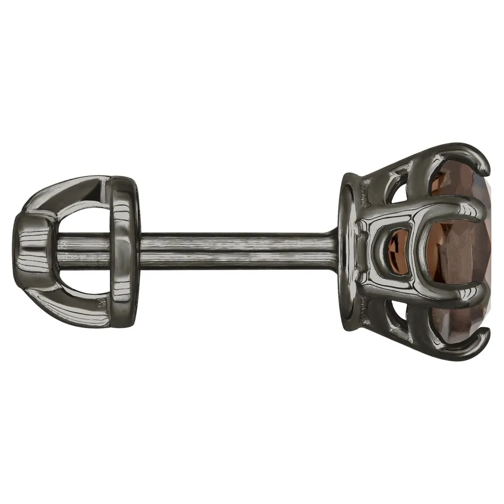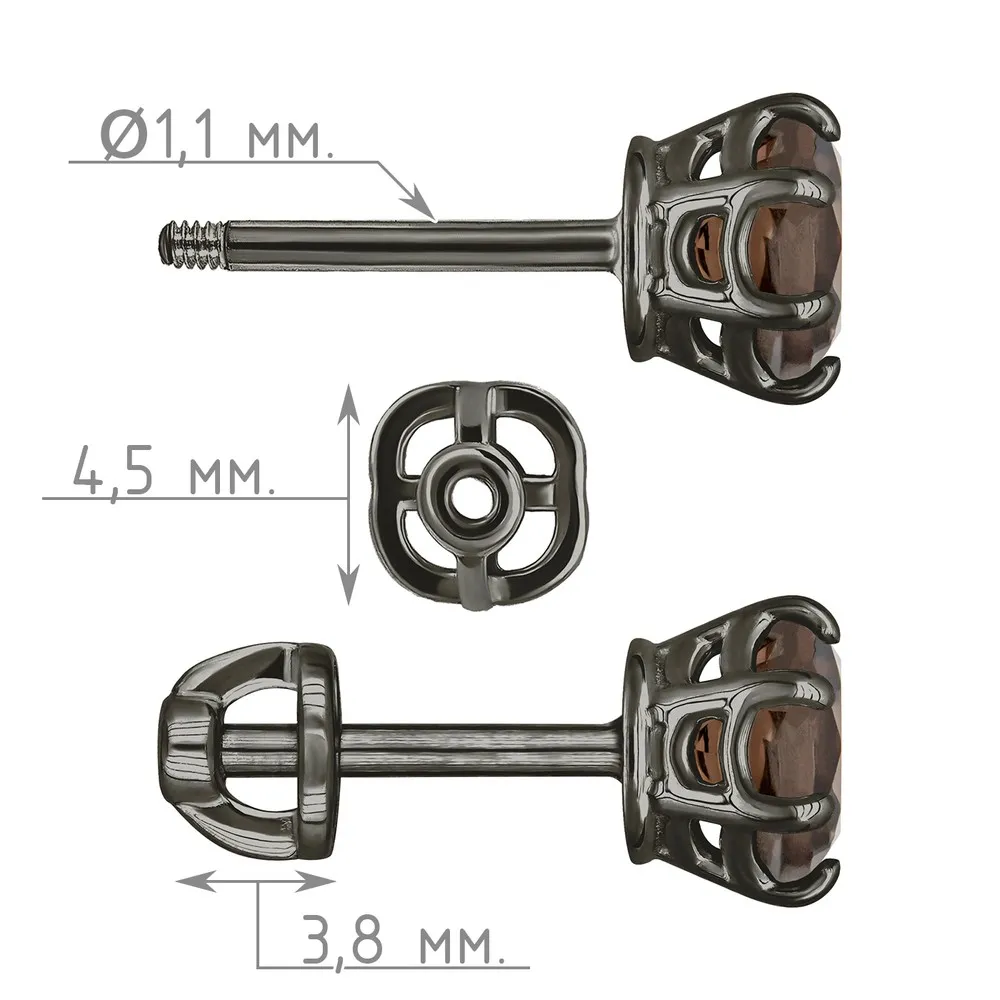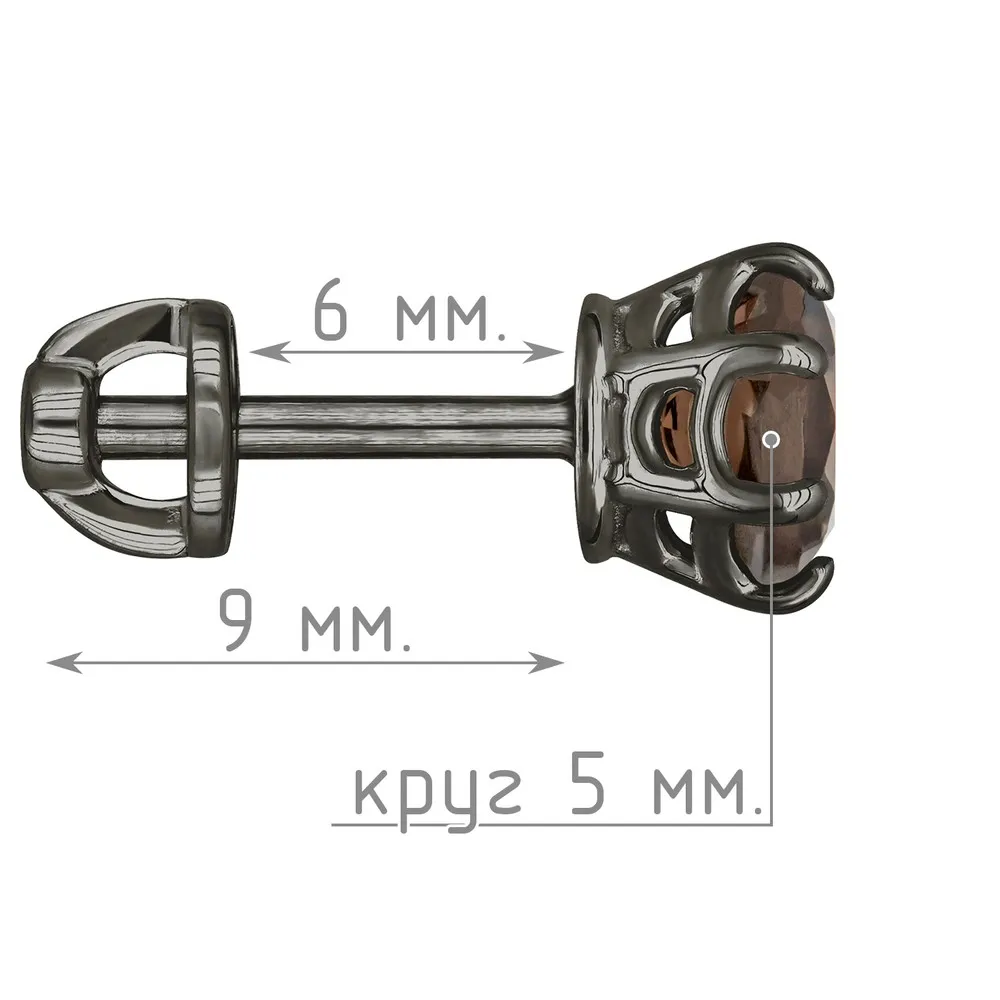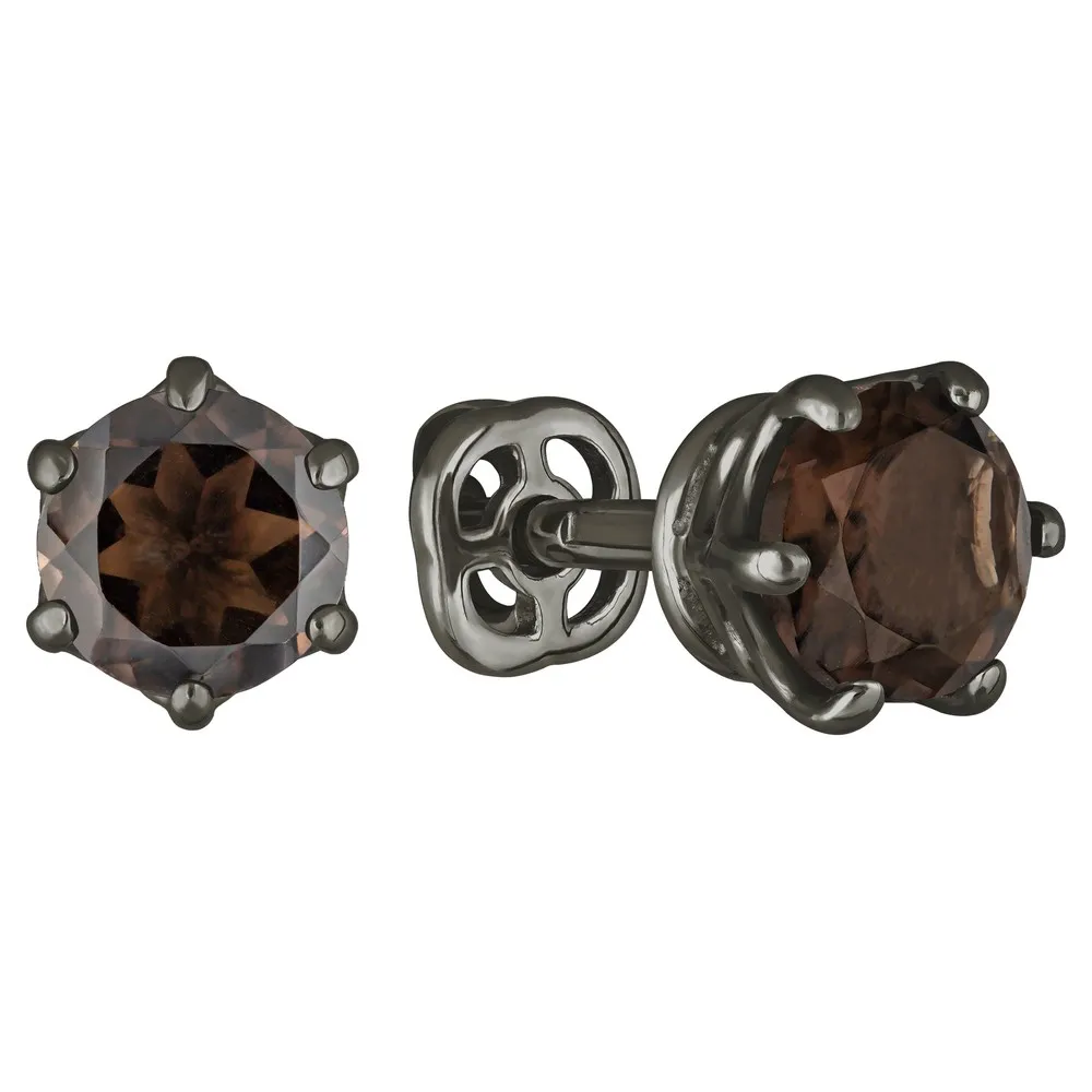 Серебряные серьги гвоздики (пусеты) с натуральным раухтопазом 5 мм. / Черный Родий.