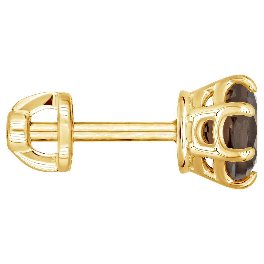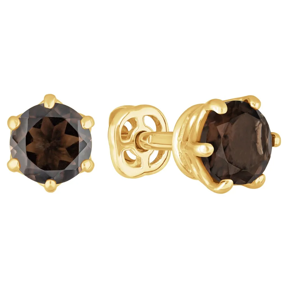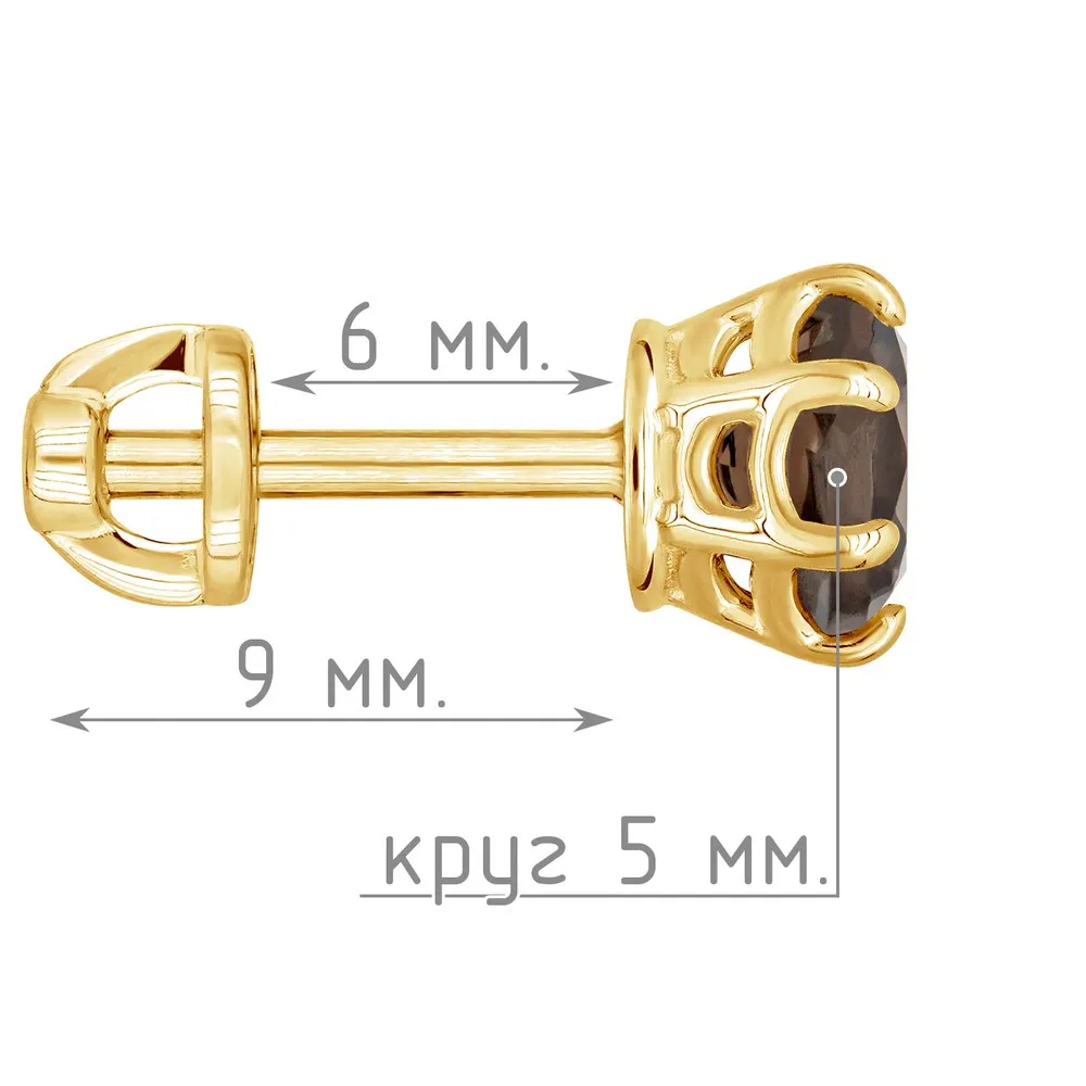 Серебряные серьги гвоздики (пусеты) с натуральным раухтопазом 5 мм. / Желтое Золото.