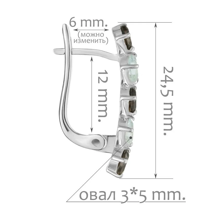 Серебряные серьги с натуральными камнями раухтопаз и топаз - коллекция Колосок. Средний вес изделия с камнями 4.28 гр. Месторождения: Раухтопаз (Дымчатый кварц)(м-ие Додо ХМАО, Россия) и Голубой топаз (Ильменские горы, Россия) Раухтопаз (Натуральный) овал 3*5 мм., средний вес: 0.32 карат. Топаз (Натуральный) овал 3*5 мм., средний вес: 0.32 карат. Все изделия собственного производства. Гарантия 12 месяцев.Арт. 8026. Раухтопаз – это разновидность кварца. Ранее он использовался в ювелирных украшениях, при вышивке картин, для магических ритуалов. Его влияние на владельца сразу становится заметно — человек успокаивается и становится рассудительным, легче выходит из депрессивных состояний. Часто использовался в приворотах, заговорах или для связи с миром духов.