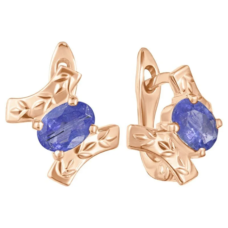 Серебряные серьги с натуральным танзанитом - коллекция Тея. Серебряные серьги 925 пробы с покрытием красное золото. Цвет покрытия соответствует швейцарскому цветовому стандарту NIHS -5N и цвету красного золота 585 в России. На последней фотографии мы разместили сравнительную фотографию 3 цвета золотого покрытия. Помимо предания золотого цвета Вашему изделию, тонкий слой золота защищает от окисления. Для более стойкого эффекта золочения и долговечности покрытия мы дополнительно наносим подслой палладия (Pd). Средний вес изделия с камнями 3.37 гр. Месторождение: Танзанит (провинция Аруша, Танзания) Танзанит (Натуральный) овал 5*7 мм., средний вес: 0.89 карат. Все изделия собственного производства. Гарантия 12 месяцев.Арт. 8124. Танзанит – интересный камень, который нашли совершенно случайно и некоторое время относили к сапфирам, пока наконец многочисленные исследования не подтвердили, что это иной минерал. Глубокий синий цвет способен восстанавливать зрение, успокаивать нервную систему. Минералу приписывалась способность приносить богатство и успех в карьере.