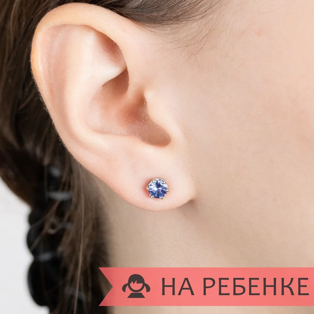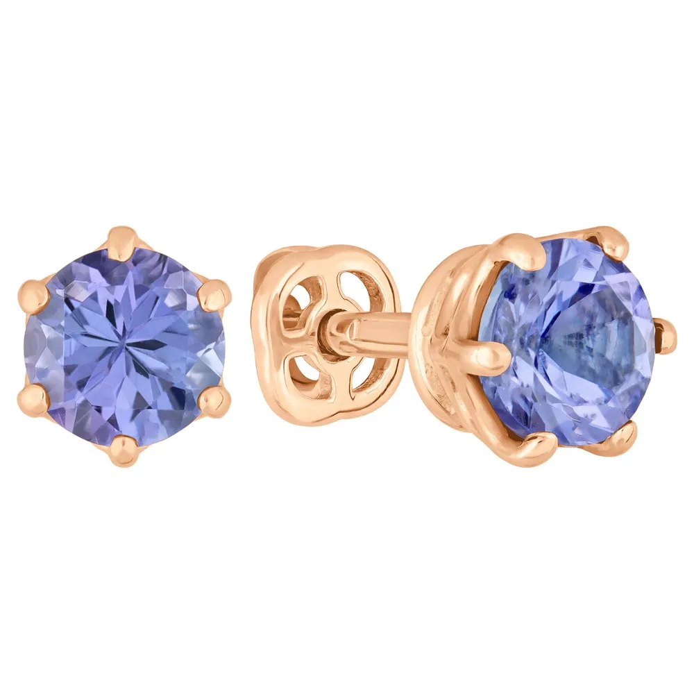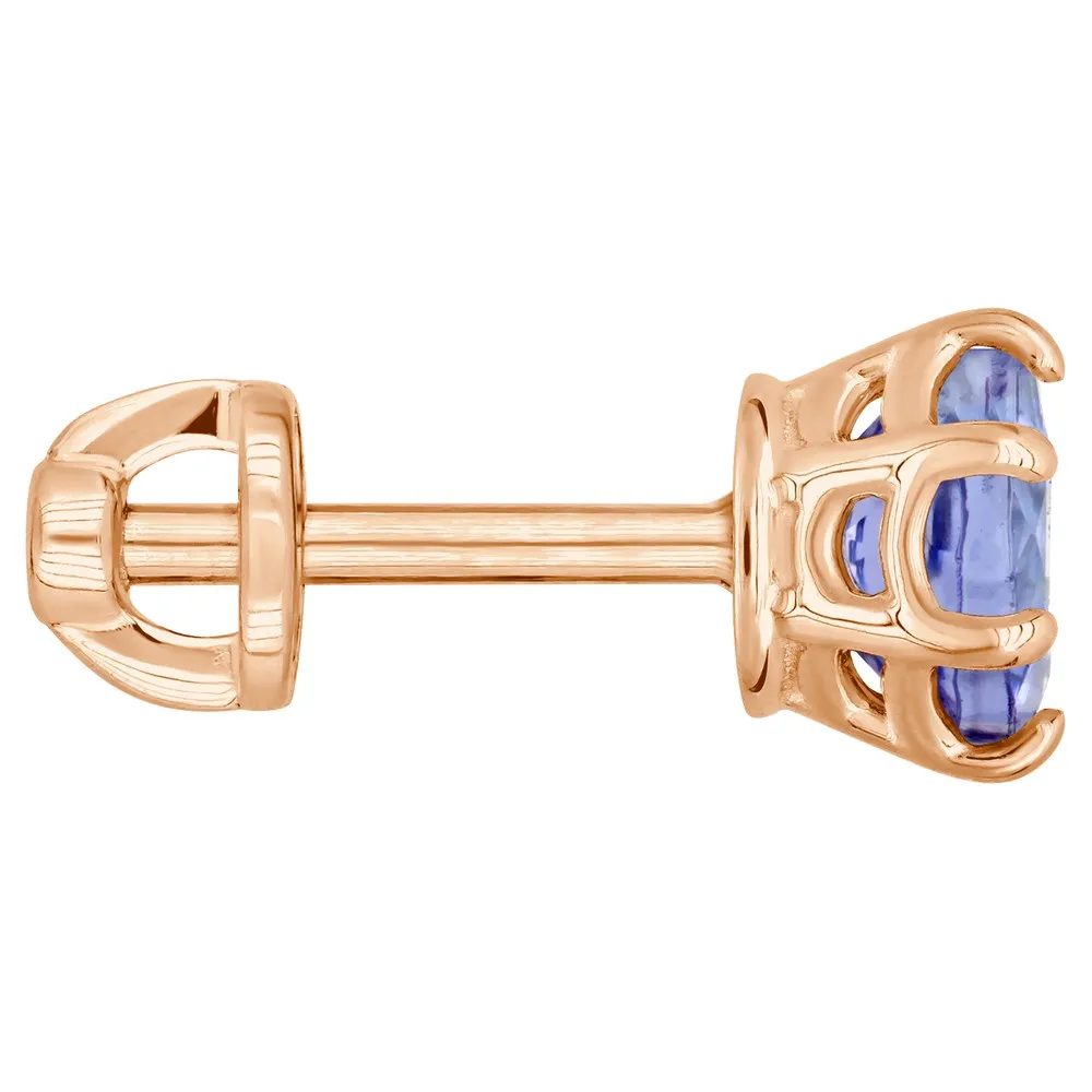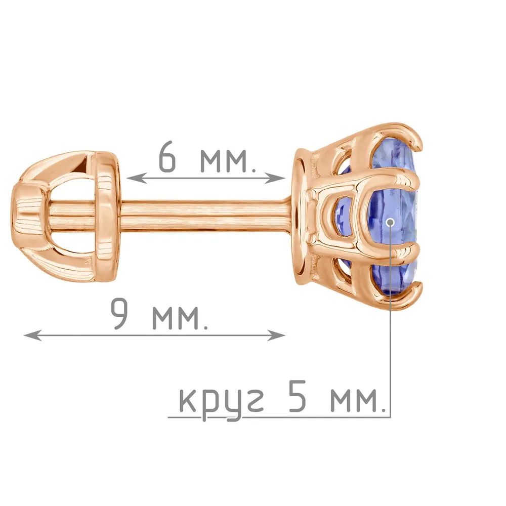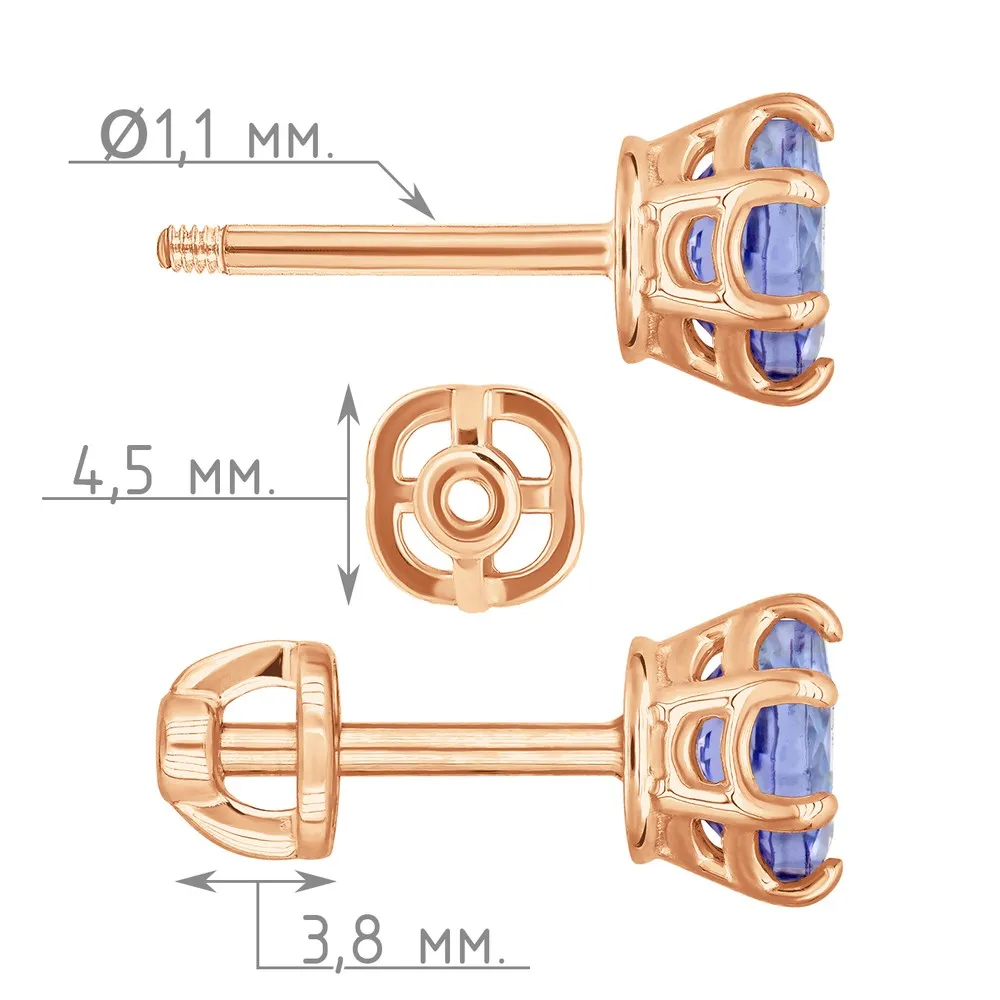 Серебряные серьги гвоздики (пусеты) с натуральным танзанитом (2 класс) 5 мм. / Красное золото.