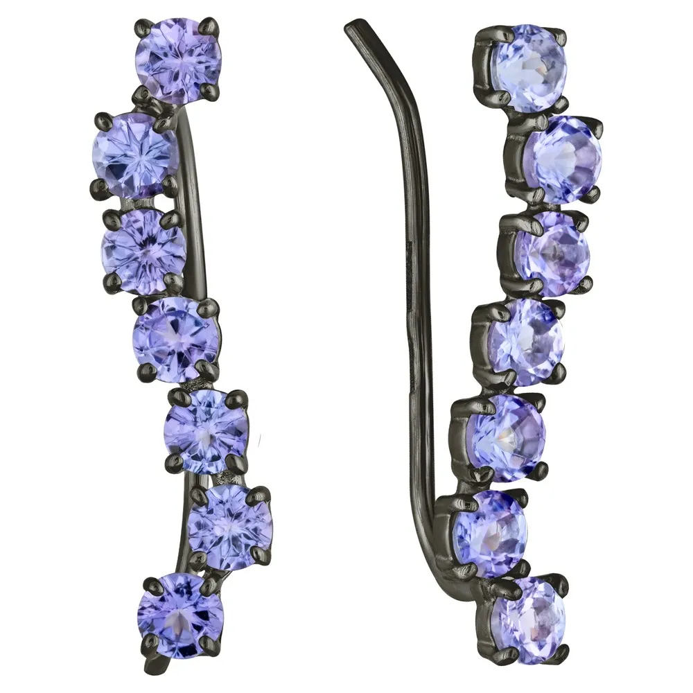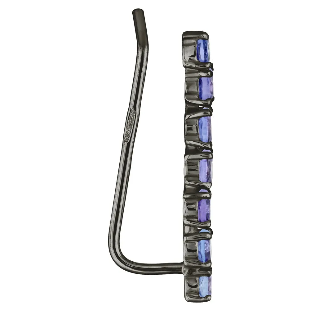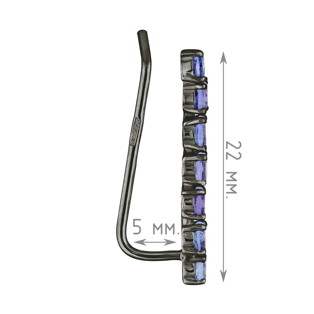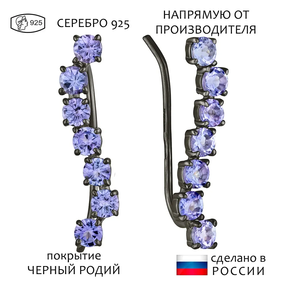 Серебряные серьги каффы с натуральным танзанитом (2 класс) - коллекция Волна / Черный Родий.