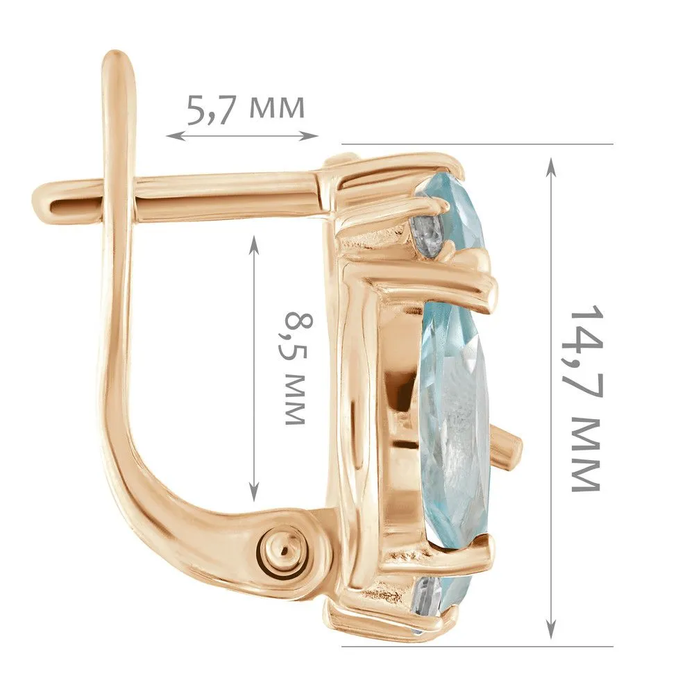 Серебряные серьги Фортуна с натуральным голубым топазом, покрытие Розовое Золото. Средний вес украшения с камнями 5,64 гр. Месторождение(я) камней: Топаз (Ильменские горы, Россия). Топаз (Натуральный) маркиз: 4*8 мм., средний вес 0,65 карат. Топаз (Натуральный) овал: 5*7 мм., средний вес 0,90 карат. Топаз (Натуральный) груша: 5*7 мм., средний вес 0,80 карат. Циркон белый (Натуральный) круг: 2 мм., средний вес 0,05 карат. Размер лицевой части: 13*14 мм. Все изделия собственного производства и имеют гарантию 12 месяцев. Арт. 6677PG . Топаз – камень, который отличаются особенным блеском и многообразной гаммой. Сверхтвёрдый и сверхпрочный, он наделен и лечебными, и магическими свойствами. Считалось, что амулет из топаза способен благоприятно повлиять на зачатие, потому часто дарился бездетным парам. Это камень дружбы и благоразумия, радости, оптимизма и надежды.