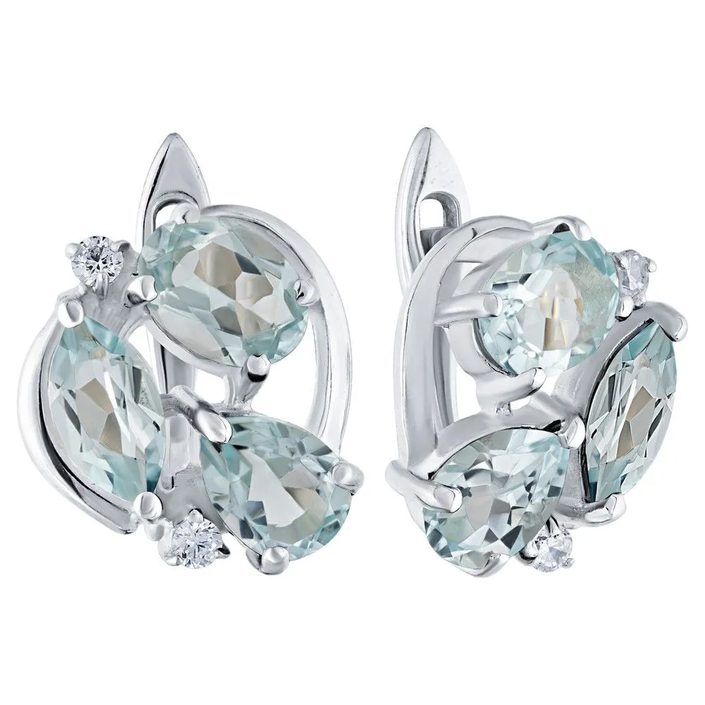 Серебряные серьги Фортуна с натуральным голубым топазом, покрытие Белый Родий. Средний вес украшения с камнями 5,64 гр. Месторождение(я) камней: Топаз (Ильменские горы, Россия). Топаз (Натуральный) маркиз: 4*8 мм., средний вес 0,65 карат. Топаз (Натуральный) овал: 5*7 мм., средний вес 0,90 карат. Топаз (Натуральный) груша: 5*7 мм., средний вес 0,80 карат. Циркон белый (Натуральный) круг: 2 мм., средний вес 0,05 карат. Размер лицевой части: 13*14 мм. Все изделия собственного производства и имеют гарантию 12 месяцев. Арт. 6677WR . Топаз – камень, который отличаются особенным блеском и многообразной гаммой. Сверхтвёрдый и сверхпрочный, он наделен и лечебными, и магическими свойствами. Считалось, что амулет из топаза способен благоприятно повлиять на зачатие, потому часто дарился бездетным парам. Это камень дружбы и благоразумия, радости, оптимизма и надежды.