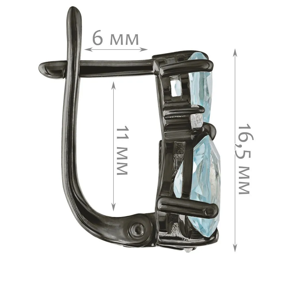 Серебряные серьги Капель с натуральным голубым топазом, покрытие Черный Родий. Средний вес украшения с камнями 5,62 гр. Месторождение(я) камней: Топаз (Ильменские горы, Россия). Топаз (Натуральный) груша: 6*9 мм., средний вес 1,60 карат. Топаз (Натуральный) груша: 5*7 мм., средний вес 0,80 карат. Циркон белый (Натуральный) круг: 2 мм., средний вес 0,05 карат. Размер лицевой части: 13*15 мм. Все изделия собственного производства и имеют гарантию 12 месяцев. Арт. 6685BR . Топаз – камень, который отличаются особенным блеском и многообразной гаммой. Сверхтвёрдый и сверхпрочный, он наделен и лечебными, и магическими свойствами. Считалось, что амулет из топаза способен благоприятно повлиять на зачатие, потому часто дарился бездетным парам. Это камень дружбы и благоразумия, радости, оптимизма и надежды.