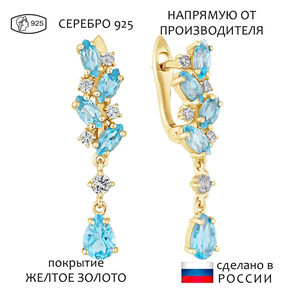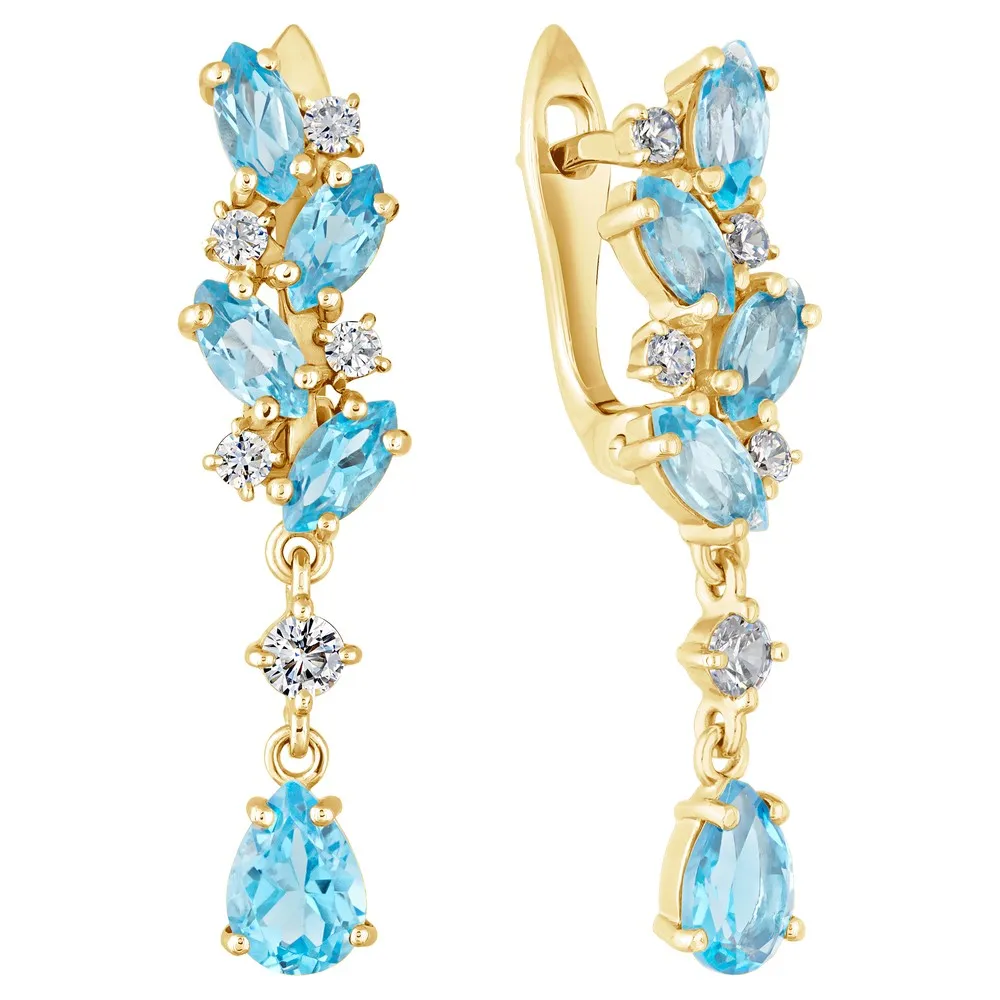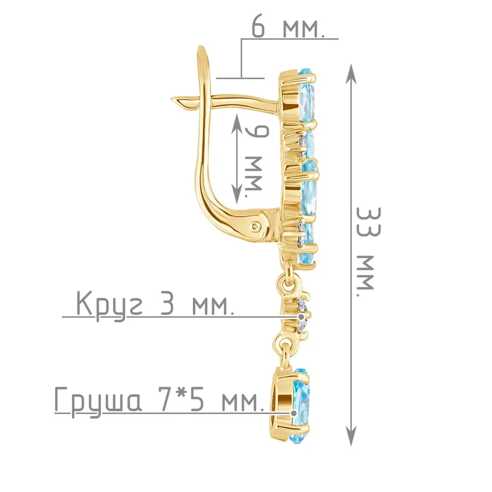 Серебряные серьги с натуральным голубым топазом (Swiss) - коллекция Росинка / Желтое Золото.