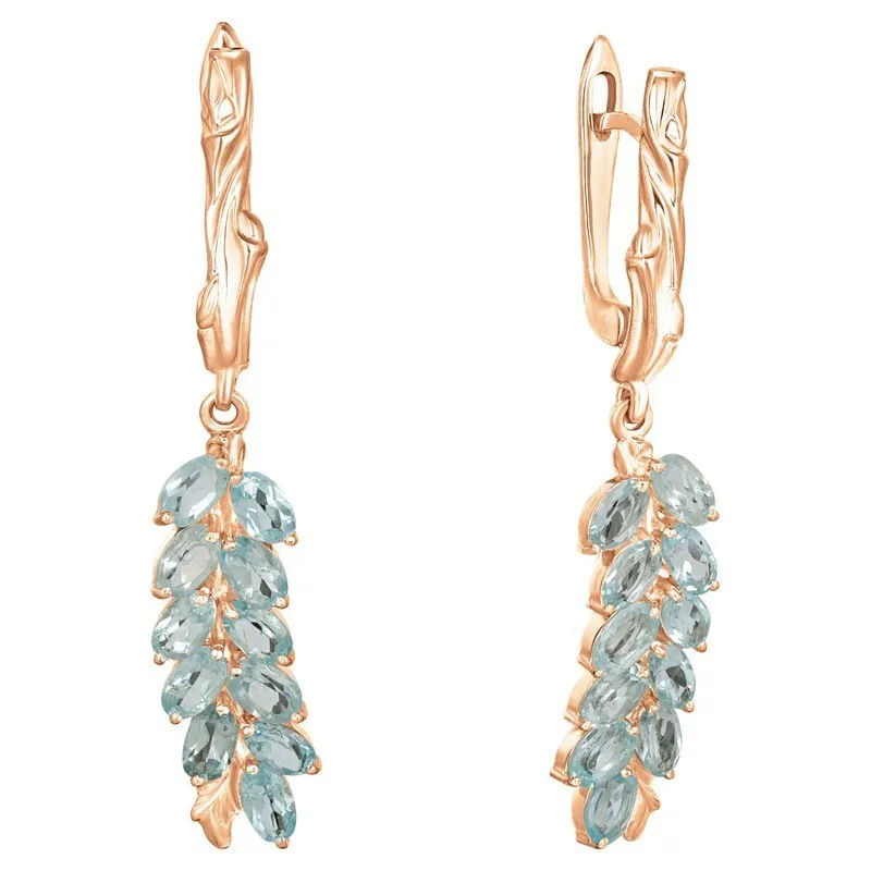Серебряные серьги с натуральным топазом - коллекция Флора. Серебряные серьги 925 пробы с покрытием красное золото. Цвет покрытия соответствует швейцарскому цветовому стандарту NIHS -5N и цвету красного золота 585 в России. На последней фотографии мы разместили сравнительную фотографию 3 цвета золотого покрытия. Помимо предания золотого цвета Вашему изделию, тонкий слой золота защищает от окисления. Для более стойкого эффекта золочения и долговечности покрытия мы дополнительно наносим подслой палладия (Pd). Средний вес изделия с камнями 7.82 гр. Месторождение(я): Топаз (Ильменские горы, Россия). Топаз (Натуральный) овал 3*5 мм., средний вес: 0.31 карат. Размер лицевой части: 9*48 мм. Все изделия собственного производства. Гарантия 12 месяцев.Арт. 7854