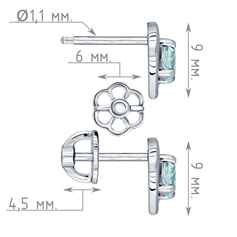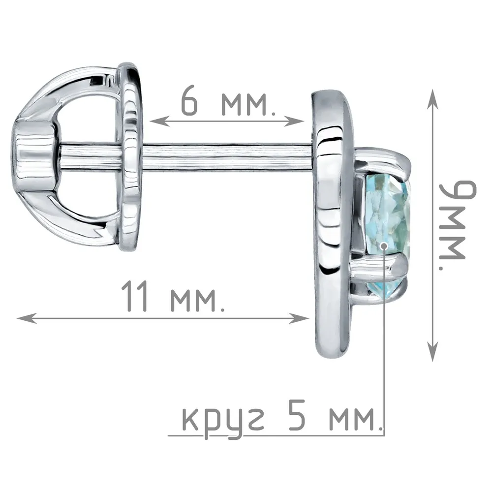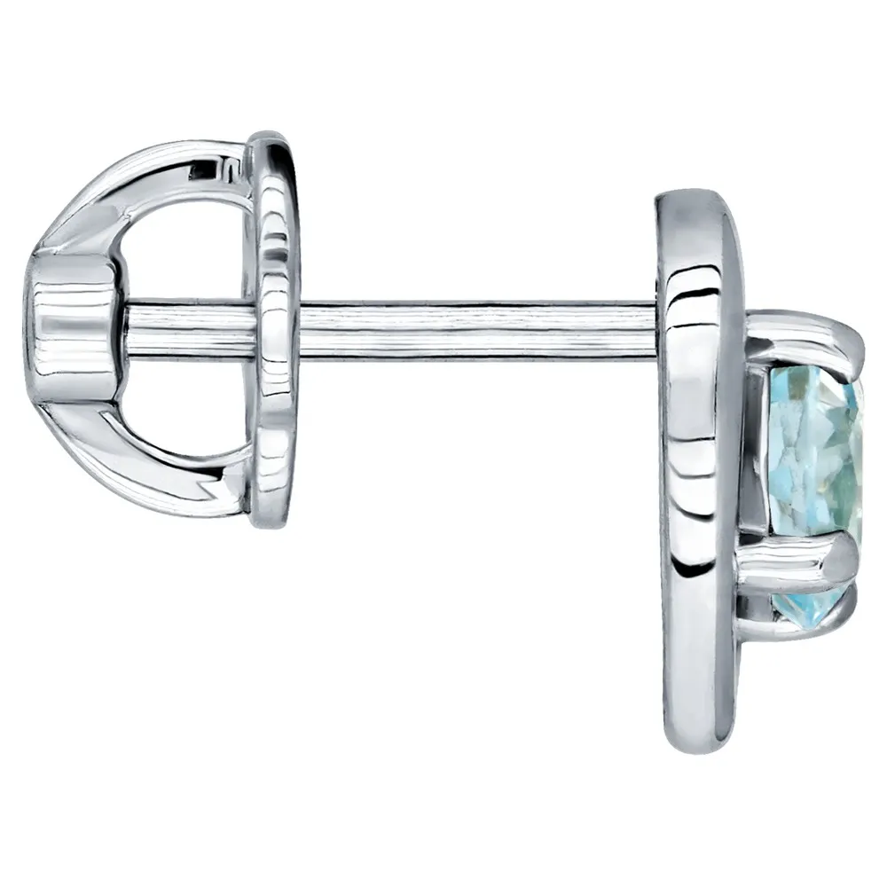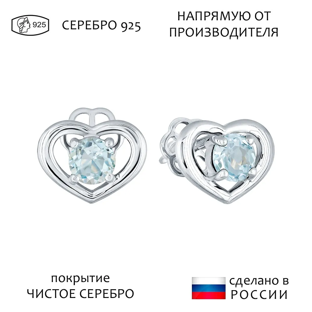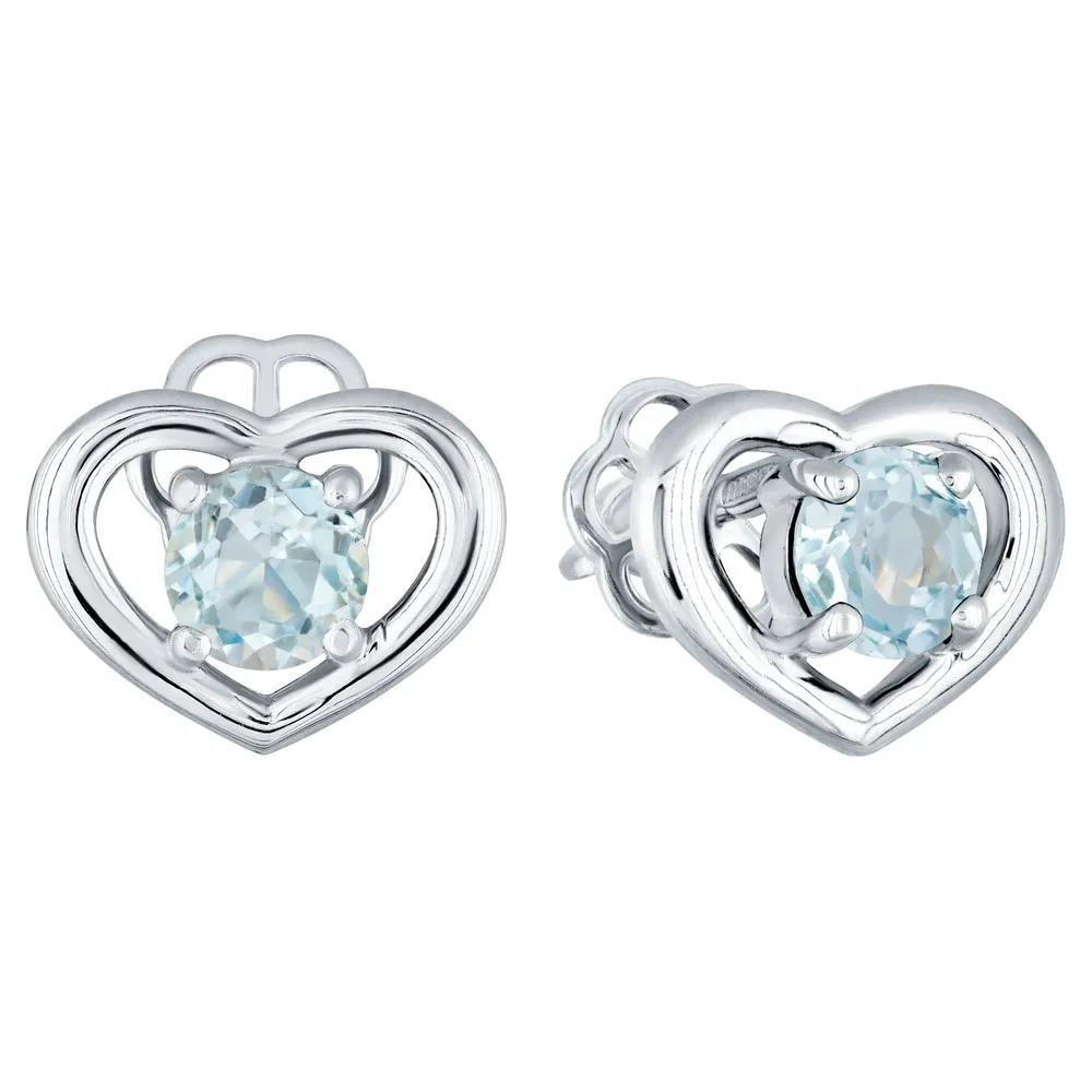 Серебряные серьги гвоздики (пусеты) с натуральным голубым топазом (Sky) - Сердце / покрытие Чистое Серебро.