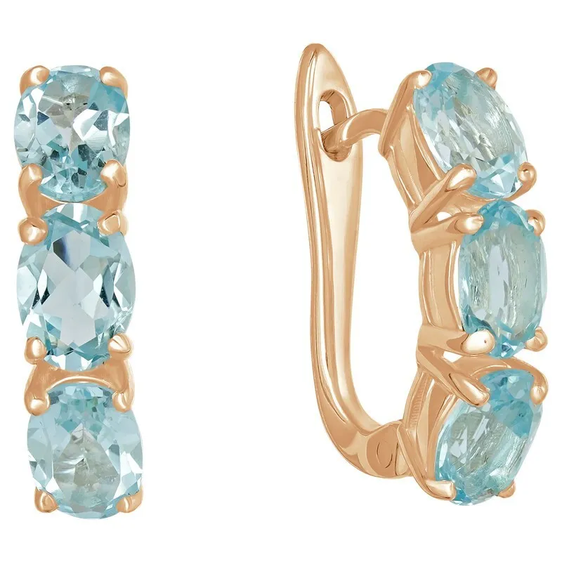 Серебряные серьги с натуральным топазом - коллекция Муза. Серебряные серьги 925 пробы с покрытием розовое золото. Цвет покрытия соответствует швейцарскому цветовому стандарту NIHS -4N и цвету розового золота 585 в России. На последней фотографии мы разместили сравнительную фотографию 3 цвета золотого покрытия. Помимо предания золотого цвета Вашему изделию, тонкий слой золота защищает от окисления. Для более стойкого эффекта золочения и долговечности покрытия мы дополнительно наносим подслой палладия (Pd). Средний вес изделия с камнями 2.57 гр. Месторождение(я): Голубой топаз (Ильменские горы, Россия) Топаз (Натуральный) овал 5*7 мм., средний вес: 0,89 карат. Размер лицевой части: 5*21 мм. Все изделия собственного производства. Гарантия 12 месяцев.Арт. 7919. Топаз – камень, который отличаются особенным блеском и многообразной гаммой. Сверхтвёрдый и сверхпрочный, он наделен и лечебными, и магическими свойствами. Считалось, что амулет из топаза способен благоприятно повлиять на зачатие, потому часто дарился бездетным парам. Это камень дружбы и благоразумия, радости, оптимизма и надежды.