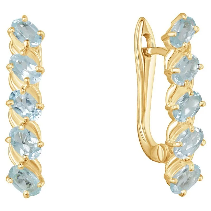 Серебряные серьги с натуральным топазом - коллекция Колосок. Серебряные серьги 925 пробы с покрытием желтое золото. Цвет покрытия соответствует швейцарскому цветовому стандарту NIHS -FF24ct и цвету чистого золото 999.99. На последней фотографии мы разместили сравнительную фотографию 3 цвета золотого покрытия. Помимо предания золотого цвета Вашему изделию, тонкий слой золота защищает от окисления. Для более стойкого эффекта золочения и долговечности покрытия мы дополнительно наносим подслой палладия (Pd). Средний вес изделия с камнями 4.24 гр. Месторождение: Голубой топаз (Ильменские горы, Россия). Топаз (Натуральный) овал 3*5 мм., средний вес: 0.22 карат. Все изделия собственного производства. Арт. 7977. Топаз – камень, который отличаются особенным блеском и многообразной гаммой. Сверхтвёрдый и сверхпрочный, он наделен и лечебными, и магическими свойствами. Считалось, что амулет из топаза способен благоприятно повлиять на зачатие, потому часто дарился бездетным парам. Это камень дружбы и благоразумия, радости, оптимизма и надежды.