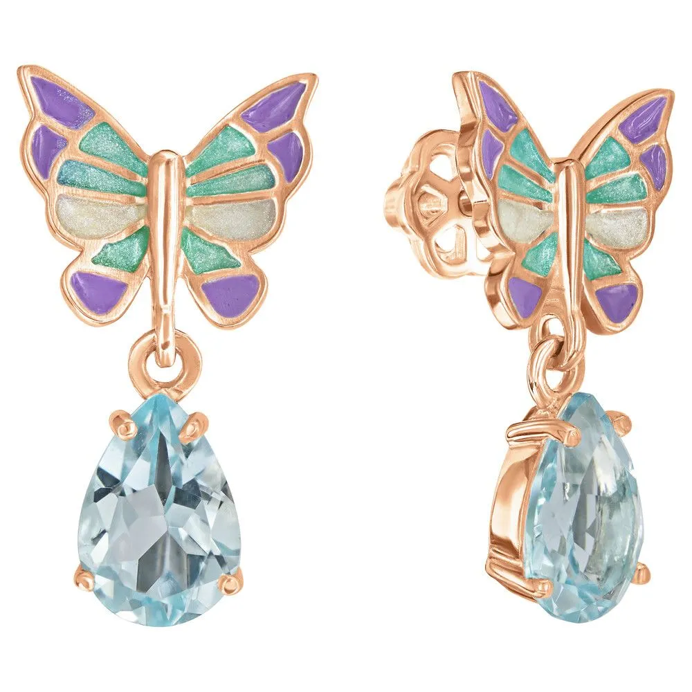 Серебряные серьги с натуральным голубым топазом и эмалью - коллекция Бабочка, покрытие Красное Золото. Средний вес украшения с камнями 3.29 гр. Месторождение: Топаз (Ильменские горы, Россия). Топаз (Натуральный) груша 6*9 мм., средний вес: 1.59 карат. Все изделия собственного производства и имеют гарантию 12 месяцев, к каждому изделию прилагается паспорт. Арт. 8441RG. Топаз – камень, который отличаются особенным блеском и многообразной гаммой. Сверхтвёрдый и сверхпрочный, он наделен и лечебными, и магическими свойствами. Считалось, что амулет из топаза способен благоприятно повлиять на зачатие, потому часто дарился бездетным парам. Это камень дружбы и благоразумия, радости, оптимизма и надежды.