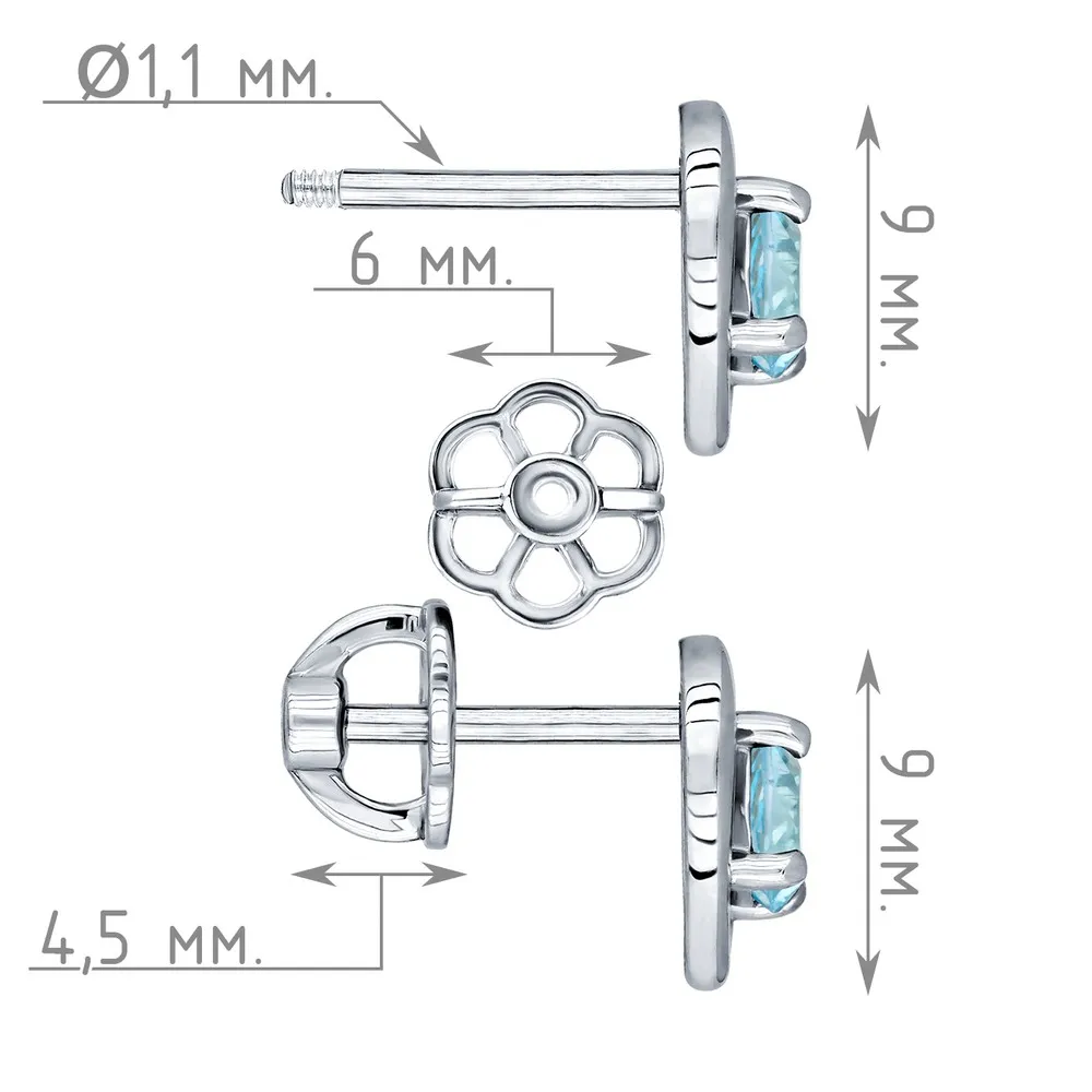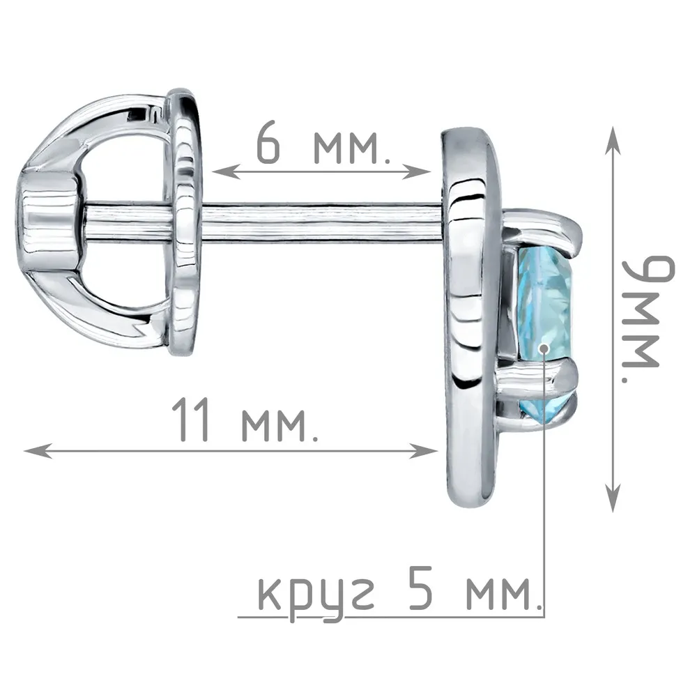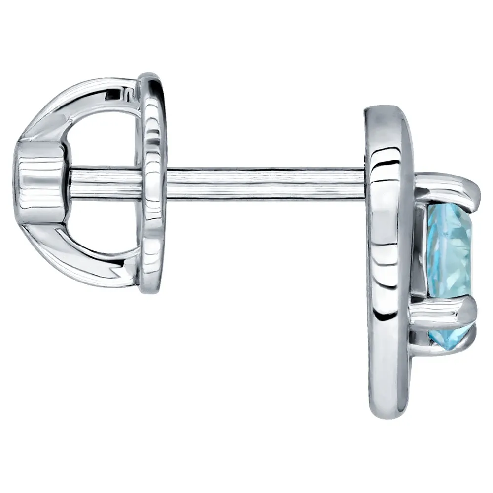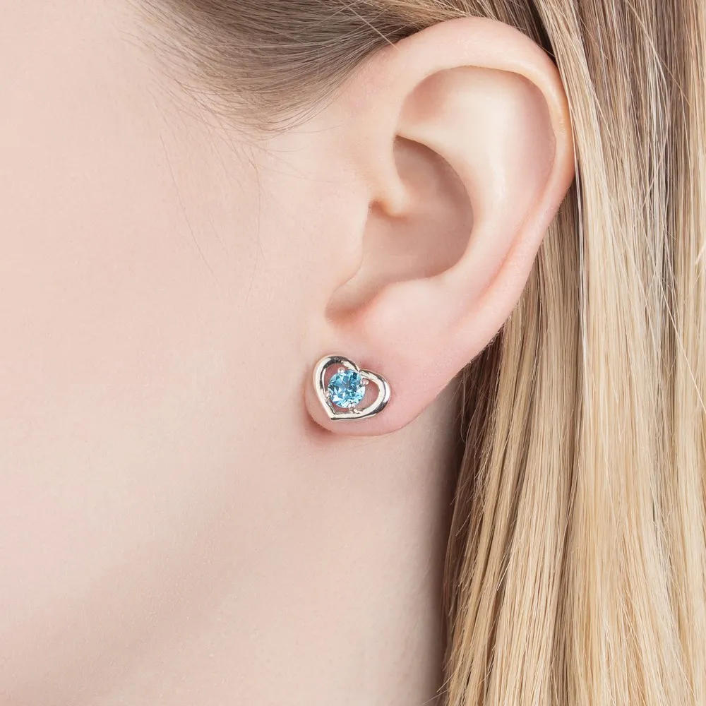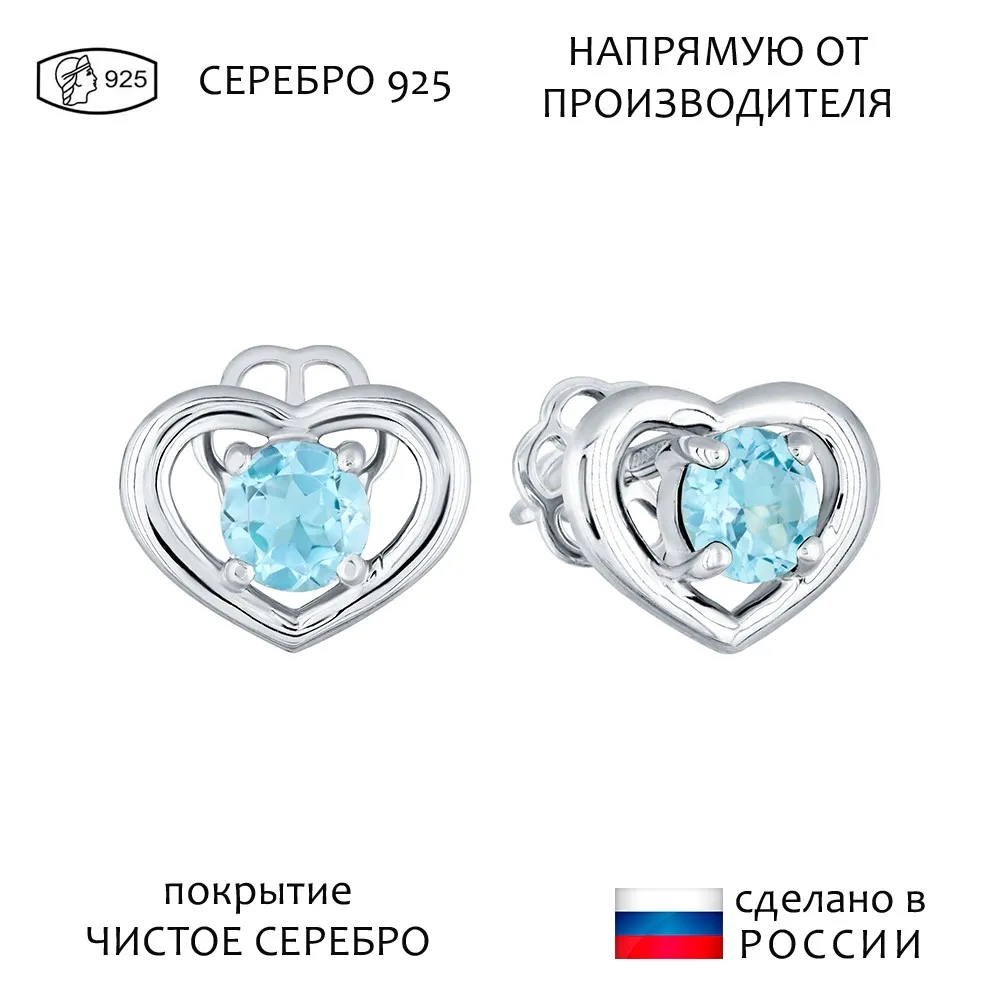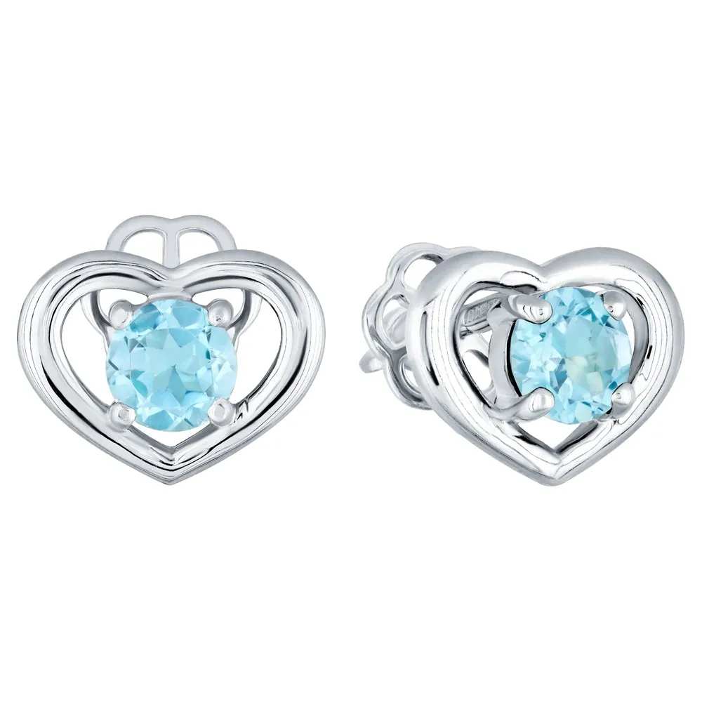 Серебряные серьги гвоздики (пусеты) с натуральным голубым топазом (Swiss) - Сердце / покрытие Чистое Серебро.