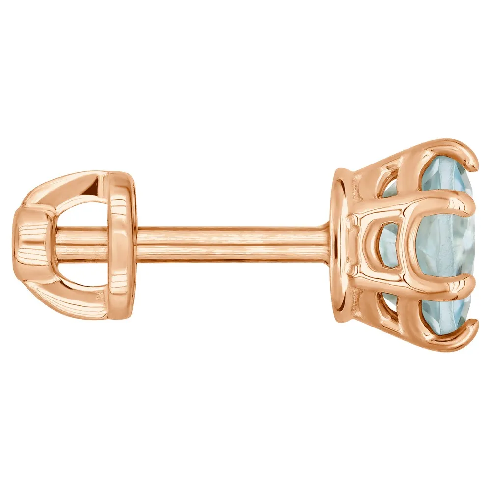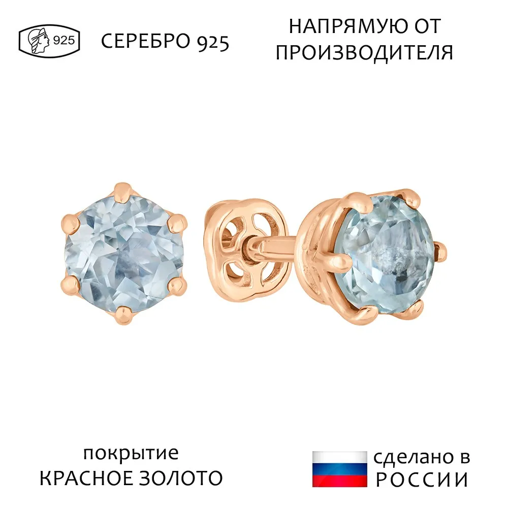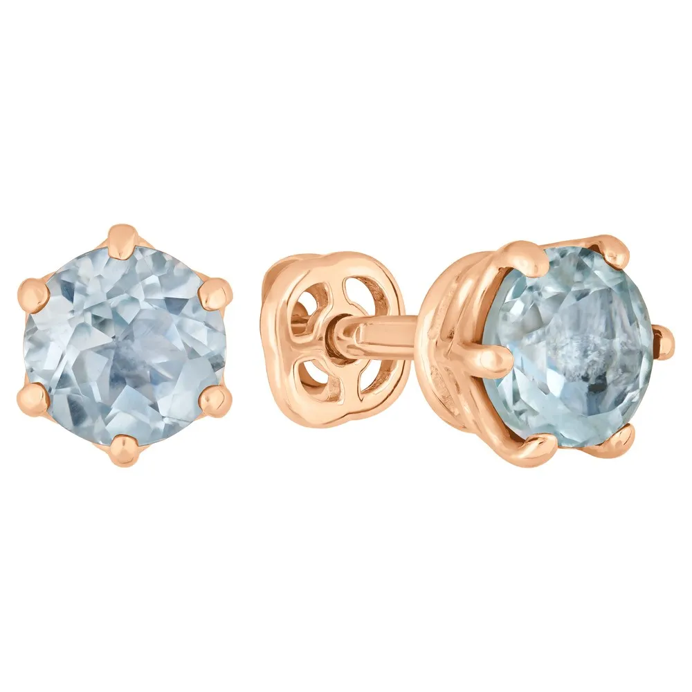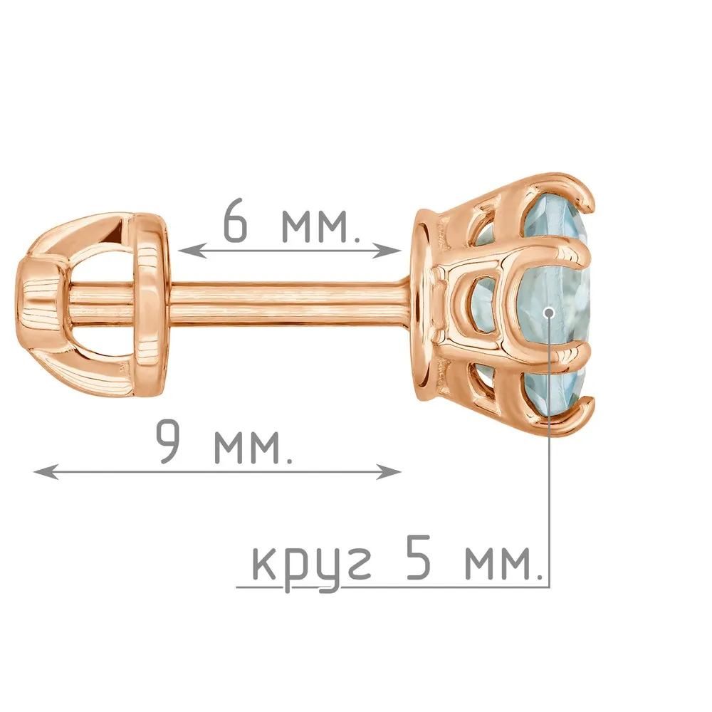 Серебряные серьги гвоздики (пусеты) с натуральным голубым топазом (Sky) 5 мм. / Красное золото.