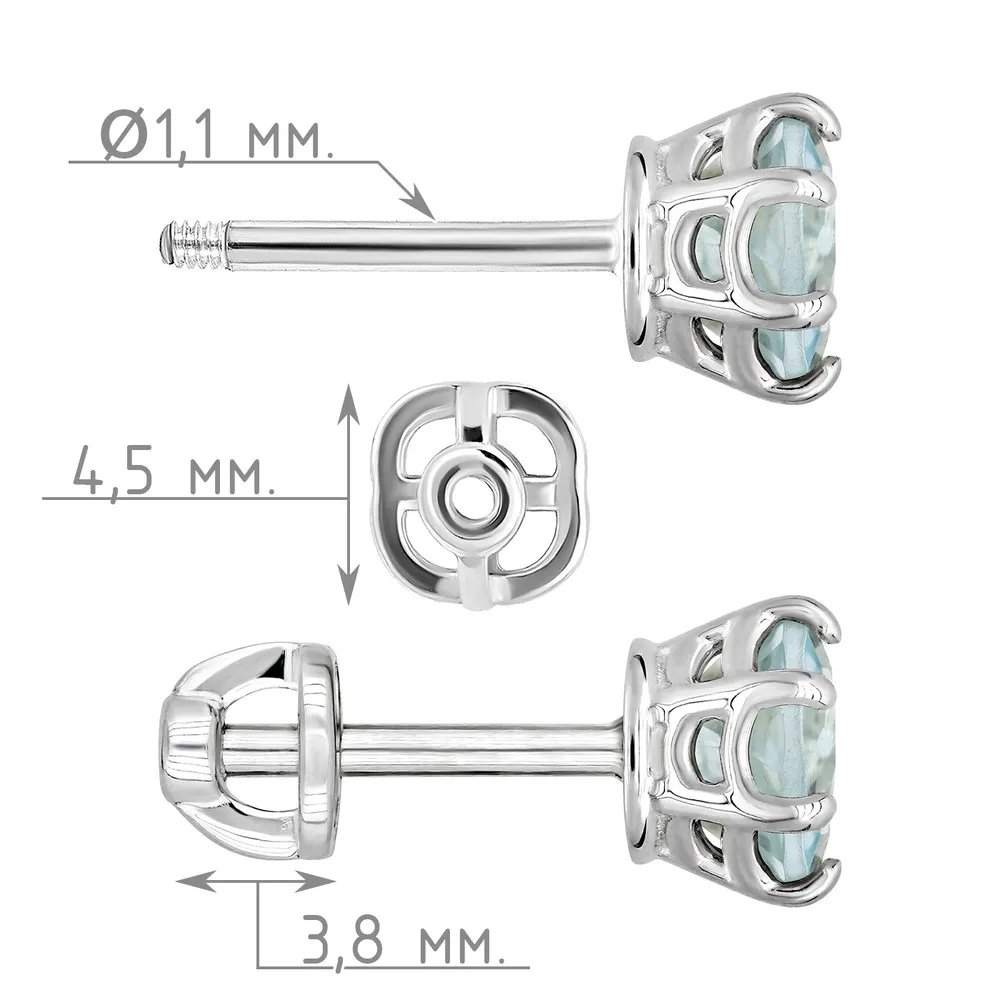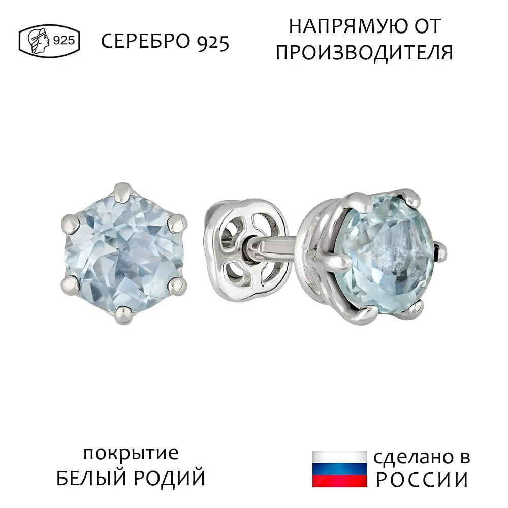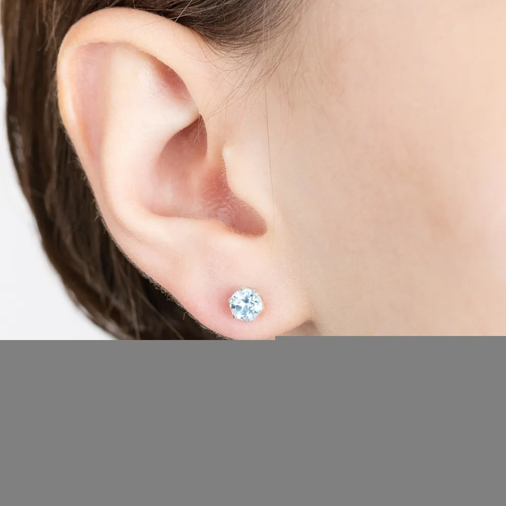 Серебряные серьги гвоздики (пусеты) с натуральным голубым топазом (Sky) 5 мм. / Белый Родий.