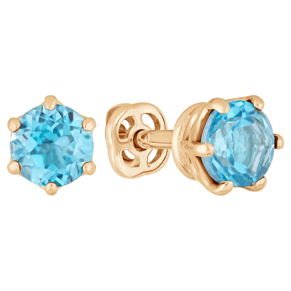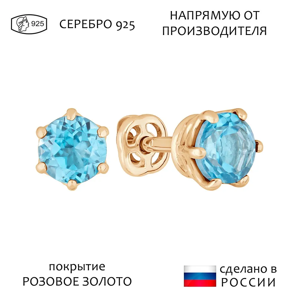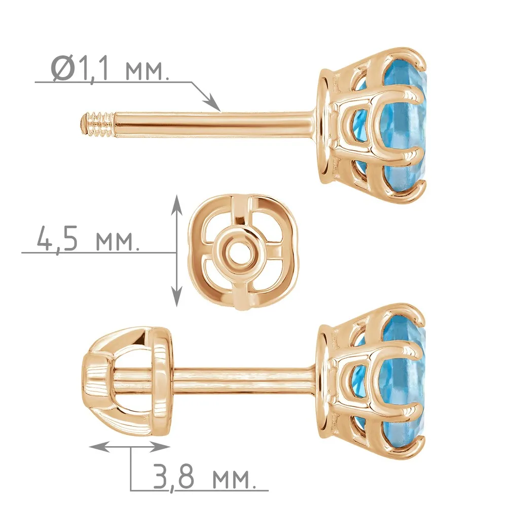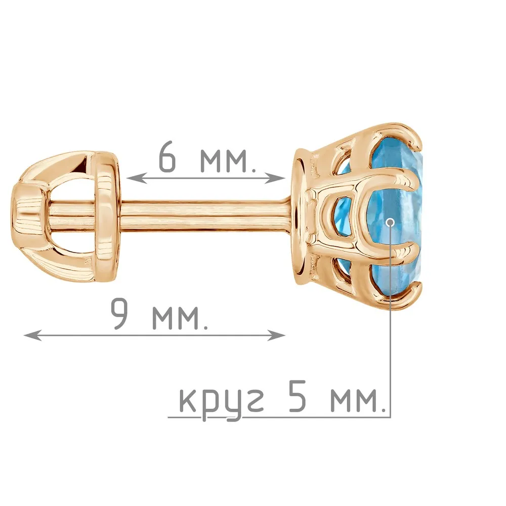 Серебряные серьги гвоздики (пусеты) с натуральным голубым топазом (Swiss) 5 мм. / Розовое Золото.